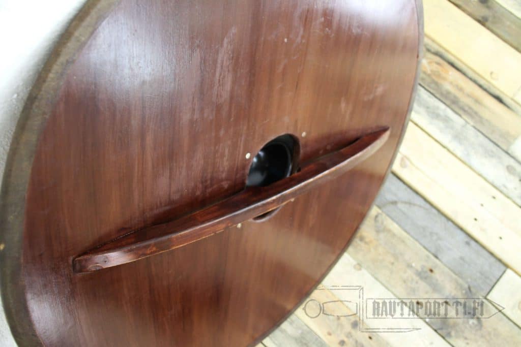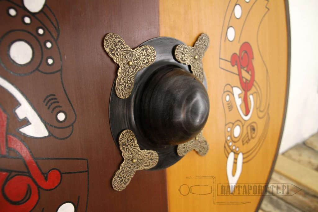 The ornamental cast brass fittings on the front of the shield are in the form of trefoil, or shamrock. This form was borrowed from the francs, who had used them as baldric mounts. When these trefoil ornaments came to the Vikings as part of a loot, their usage changed, and they were typically worn as a brooch to fasten a shawl for example. The decoration of the fittings on this shield is a combination of the zoomorphic Borre and Jellinge styles: the animal masks and the balance of the composition are characteristically Borre, and the contours and spirals are typically Jellinge. This type was mostly found in Norway and Denmark.