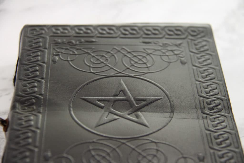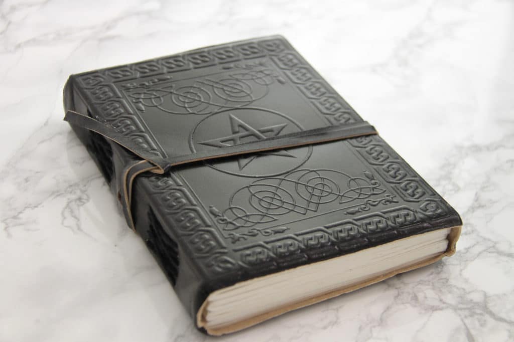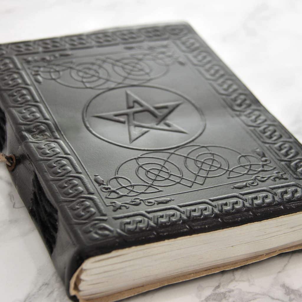 This journal has thick embossed leather covers and inside you can find approx. 200 empty handmade paper pages waiting for your notes. The black leather covers have pentagram and other small ornaments embossed on them. The pentagram as a symbol is older than history itself and the earliest survived use we know of come from Sumer 3000 BCE (from the first known civilization). The pentagram has represented different ideas at different times but whether you are a Pythagorean, Christian or Wicca the common belief is in the magical properties and powers of this symbol. During medieval times the pentagram was a Christian symbol for health that gave protection from evil spirits and witches but nowadays the pentagram is more commonly thought as a symbol for Satanism.