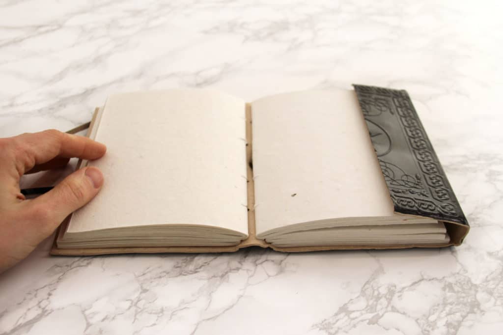Book can be closed and tied using a leather strap. Thickness of the cover leather is approx. 2 mm. Approx. 200 writable pages.
