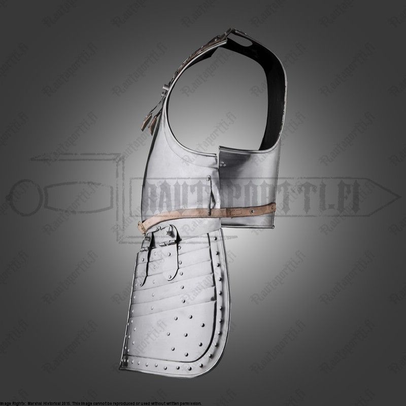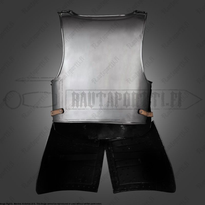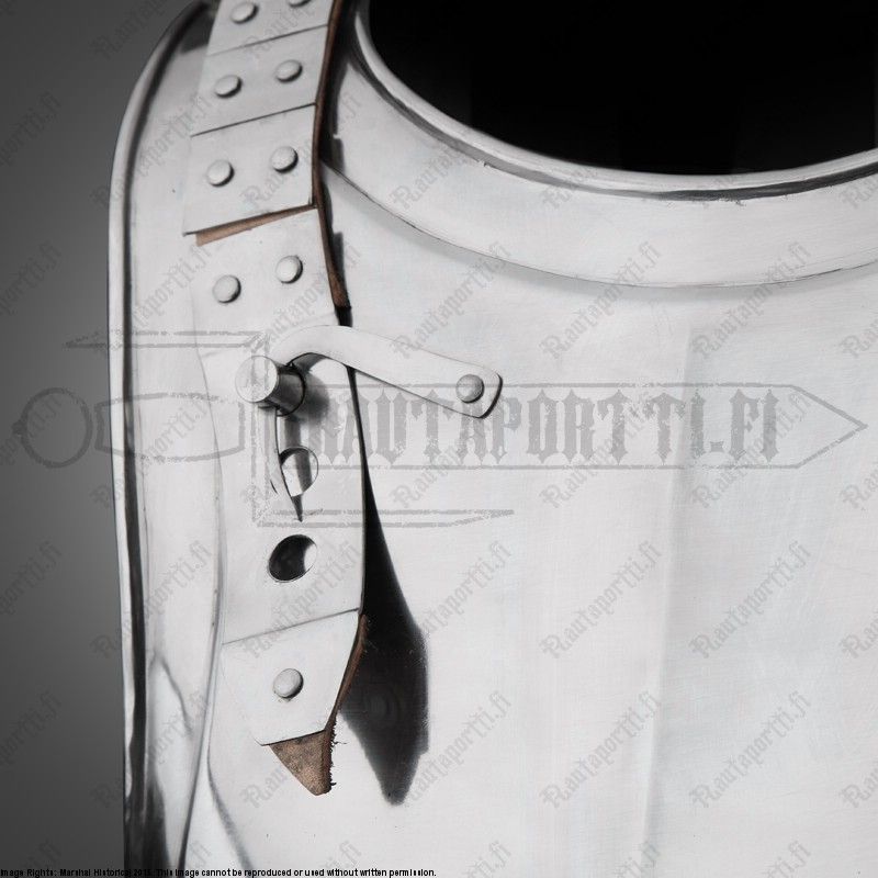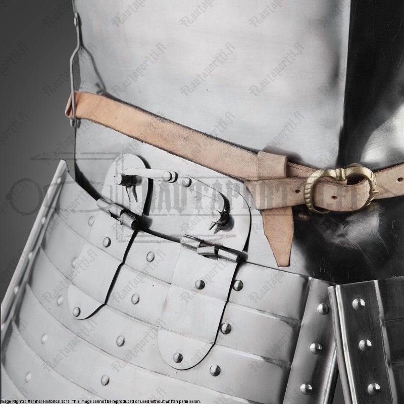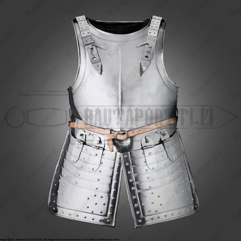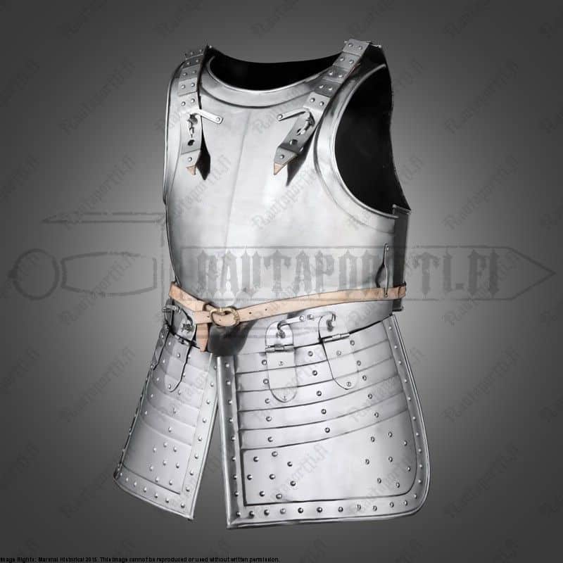 The chest plate and tassets are of a very good quality and are aesthetically pleasing (especially the pattern on the tassets). It is also easy to get on with it not requiring another person to fully put on like some armour. The mirror finish is also great with it rusting slowly and being easy to maintain with wax or oil as well as having a very reflective and smooth surface on the steel (try to avoid using even fine grit sand paper to remove rust as the finish is delicate and hard to restore). The leather on the belt and the shoulder straps is also high quality. The tassets being detachable is also a great feature as while they look great and finish the half-plate look they limit mobility and overlap so clatter together making lots of noise. It was also delivered in only a few weeks at a low price for the weight and the distance all the way from Finland to the UK, also I was able to reschedule the delivery to after I came back from holiday without an extra cost.