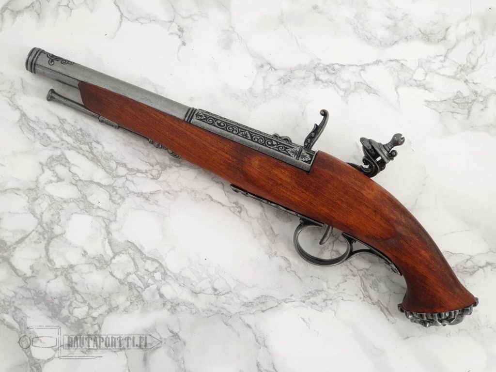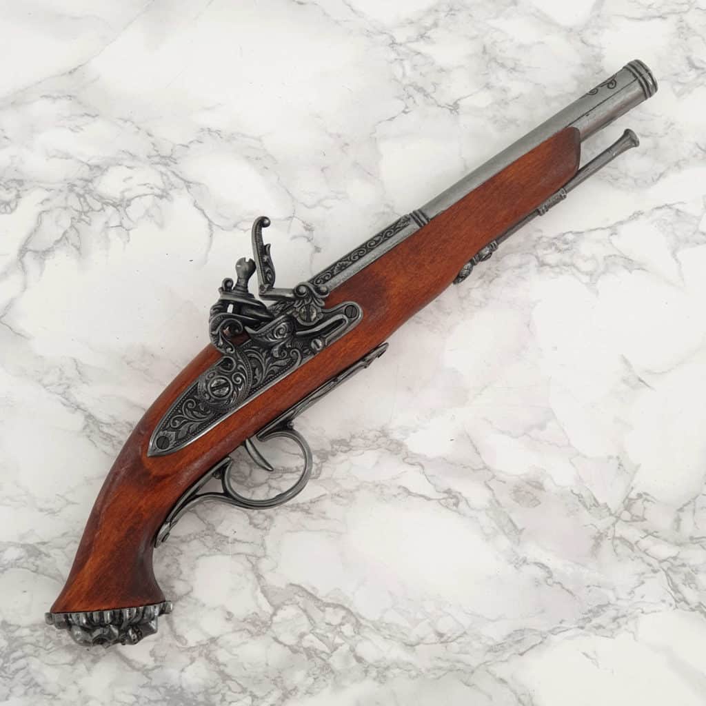 This flintlock pistol dates to the 18th century, towards the end of the golden age of piracy.