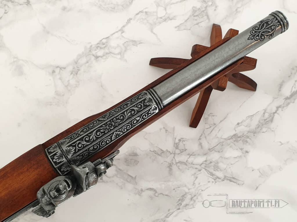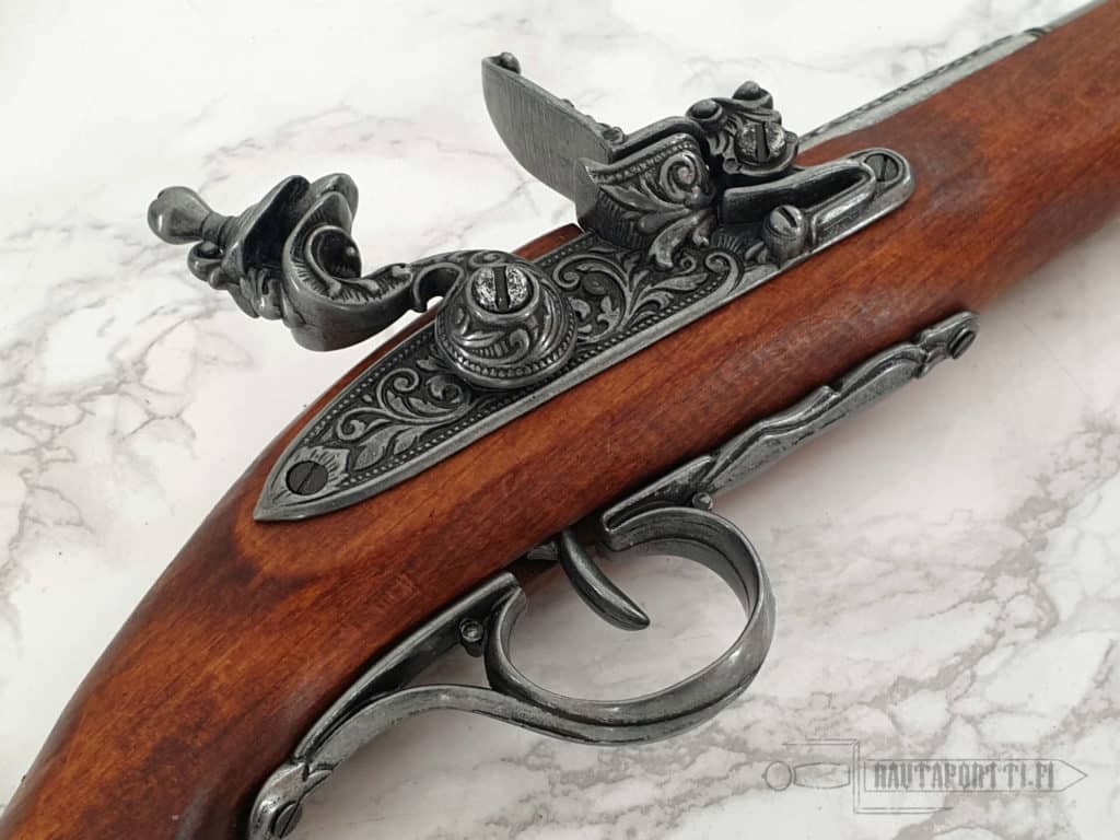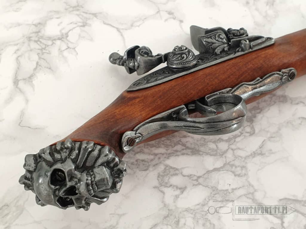 The weapon is decorated with rich ornaments. The butt of the hardwood stock has a skull-and-bones motif, an unmistakable emblem of pirates still recognized throughout the world today.