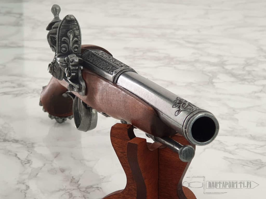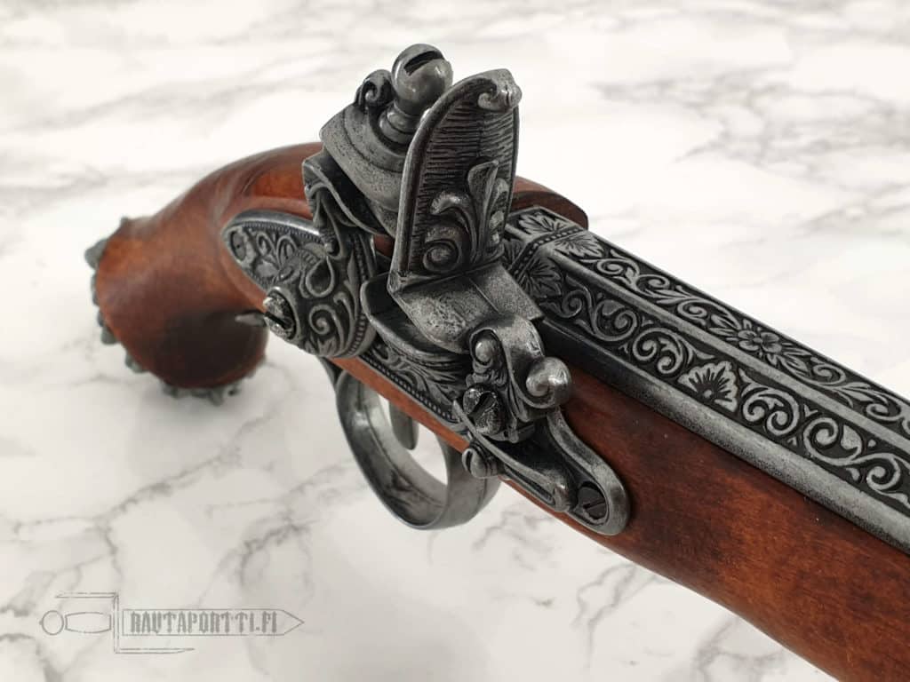 Flintlock pistols were used as self-defense weapons and as a military arm. Their effective range was short. In combat these weapons were often used only for a single shot, since the method of reloading was very slow, which is why they were frequently used together with a sword. After the single shot the pistol could be used as a small mallet, to block an opponent’s sword strikes, or to throw at an opponent.