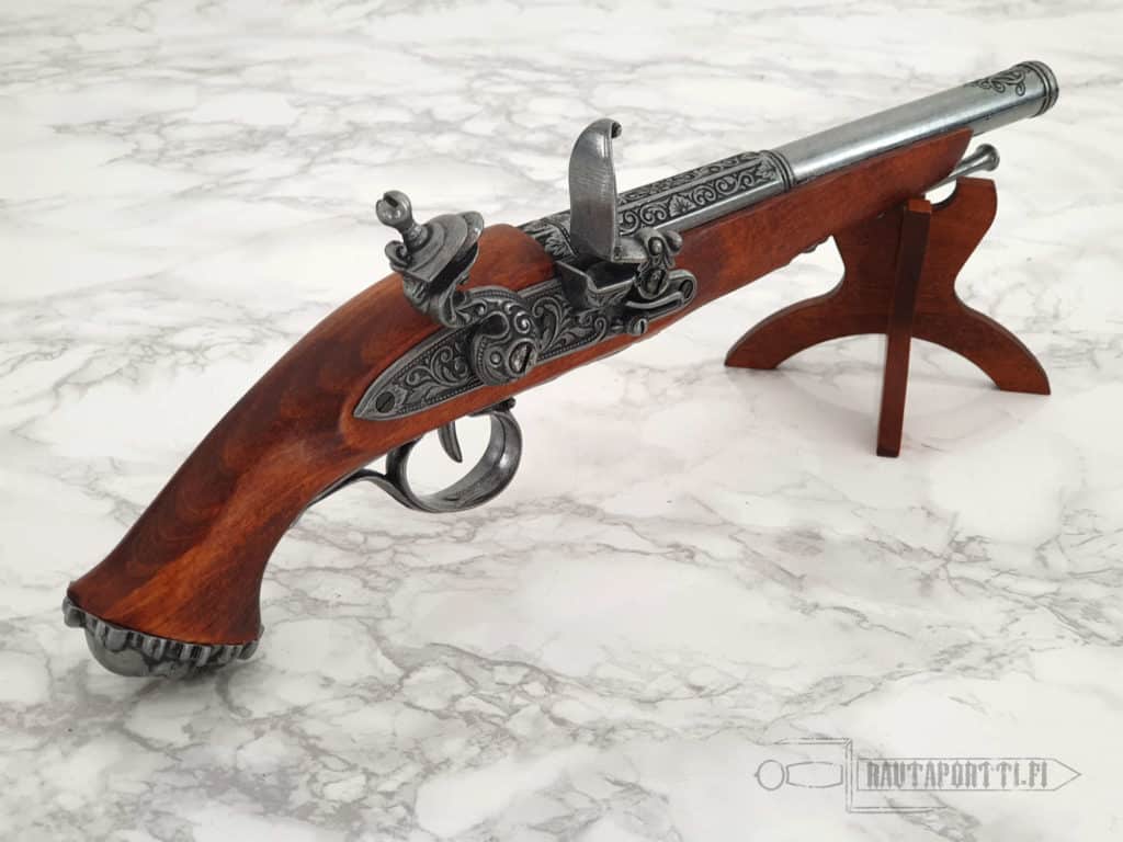 Flintlock pistols were muzzle-loaded pistols in which the blackpowder charge ignites when the flint strikes a spark from the steel part of the lock. Flintlocs became common during the 17th century and maintained their popularity until about the middle of the 19th century, when they were replaced by the more reliable and easier-to-use percussion caps, which were less prone to being affected by the weather and other circumstances.
