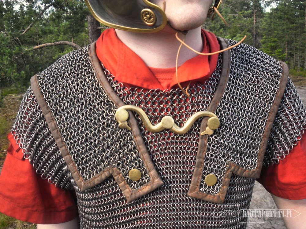 Authentic Roman legionary mail shirt The shoulder pads are fastened at the front with brass buttons and hooks Rings made of 1.6 mm thick spring steel have an inner diameter of 8 mm Four rings through the fifth weave Available in sizes M, L and XL