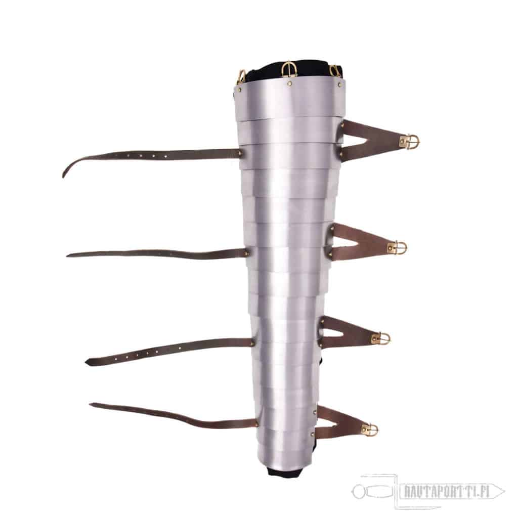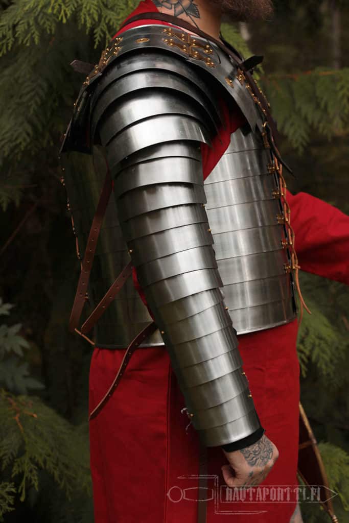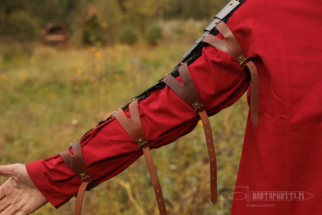 This manica has four leather straps to tighten the armor to your arm. In addition to the leather straps, we recommend that you hang the manica from the top end also. This prevents it from slowly drifting down during battle. The manica has buckles at the top end ready for this.