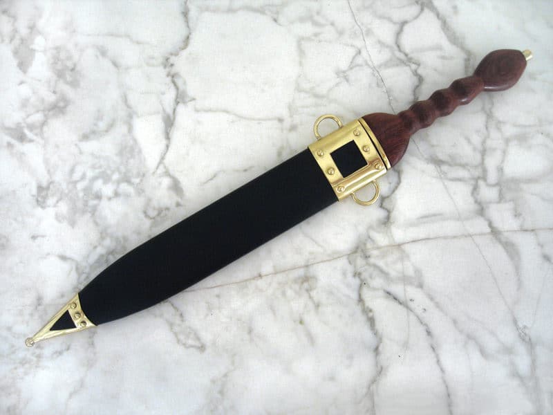 The distinct shape of the Pugio blade was excellent for a close quarters fight, and was used throughout the legions, from the rank and file to the highest in command. The legionnaires used these daggers also as general tools. Outside of the army, the Pugio was a typical weapon in assassinations and suicides; for example Julius Caesar was assassinated with a Pugio. Although swords and knives were generally not worn by civilians within the boundaries of the “Pax Romana”, barbarians and bandits were certainly to be found in the outlands, and a merchant or trader best go armed. No doubt many an old legionnaire must have found it easier to keep his balance with the familiar weight on his hip as he worked his farm in new won territory. A wood hilt is paired with a fully tempered high carbon steel blade. Comes complete with a wood scabbard covered in leather with brass parts. Based on remains in the British Museum.