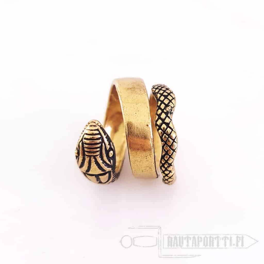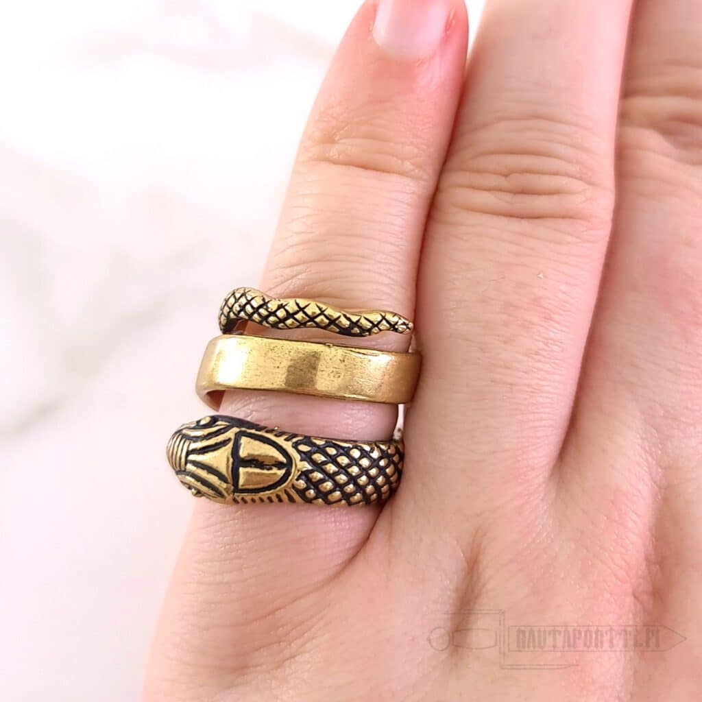 This serpent finger ring is not closed on the underside to form a solid ring. The spiral shaped open style allows the serpent ring size to be adjusted slightly. Size can be adapted to a ring diameter of 17 to 21 mm. The roman ring is made of quality bronze, and it can be worn as a perfect accessory for historical reenactment, LARP costumes or as everyday jewelry.