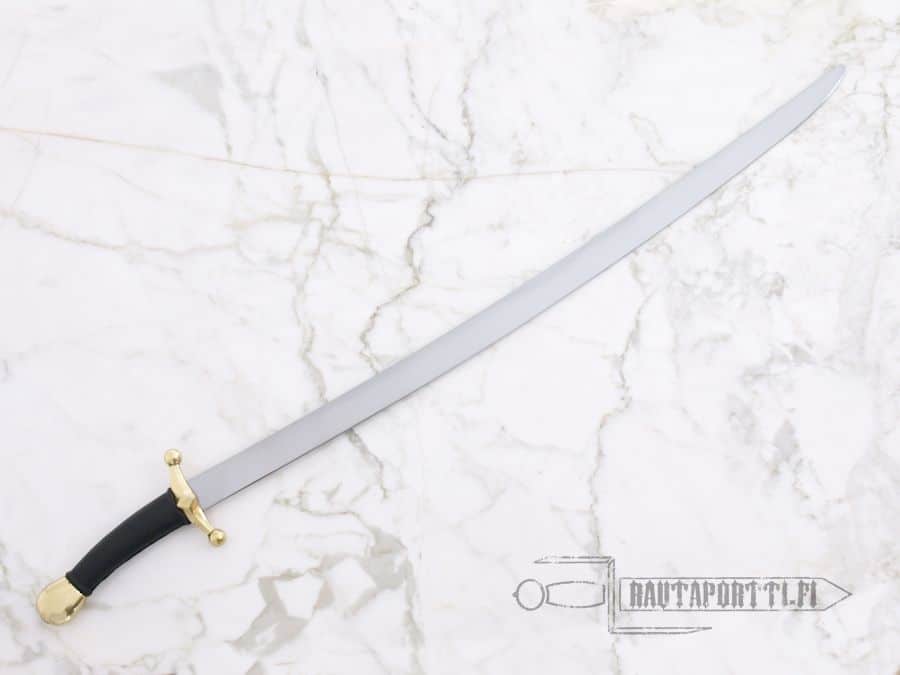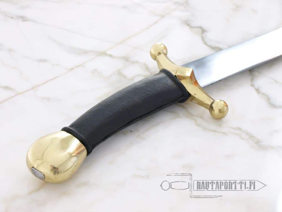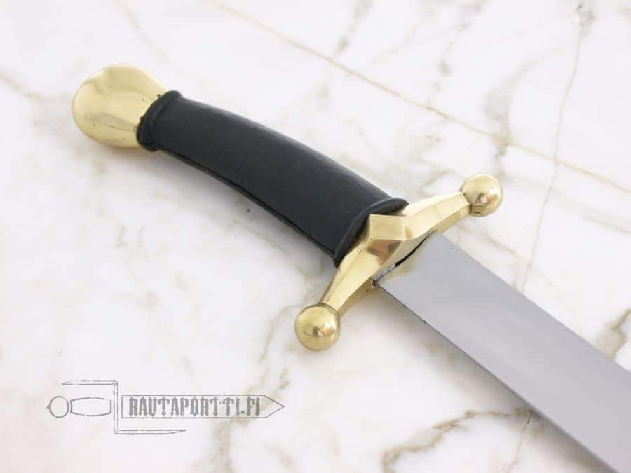 Built to withstand combat use by reenactors and stage performers. Forged of 51CrV4 carbon steel, and tempered to around HRC 50-52. The edges and points are thick and rounded for better nick resistance and safety. This sword is crafted using same methods as original historical pieces with riveted pommel and the stout beechwood grip is covered with leather.