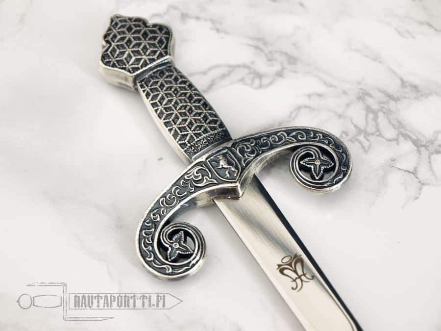 The original sword is gilt in silver and decorated with detailed filigreework. The pommel and the downward turned quillions are in the shape of trefoils, common in the Andalusian mozarabic style. The same type of ornamentation is also seen in the illuminated Cantigas, a collection of medieval musical poems from that time, attributed to Alfonso X the Wise. The arms of Castille and Leon confirm that the sword is a royal one. These together give credence to the claim that the sword has indeed belonged to San Fernando, or he gave it to his son Alfonso.