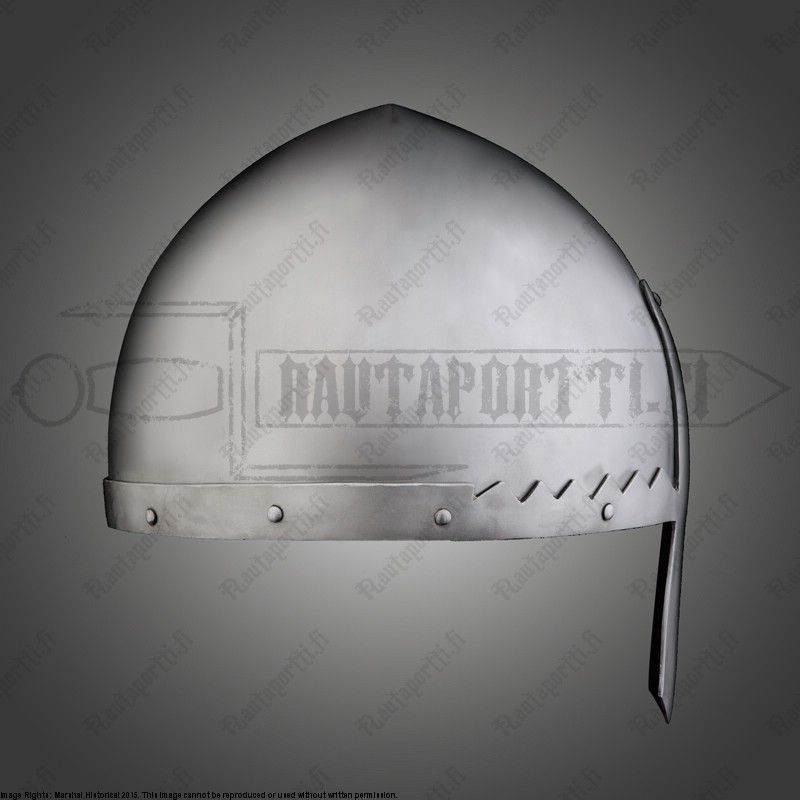 The spangenhelm was an early method of helmet construction, but single-piece skulls like this one, being technically more difficult to produce, became more common with the increase in metallurgical skill over time. The nasal helmet appeared throughout Western Europe late in the 9th century, well before the Normans who would make the helmet type so famous. The nasal helm declined in popularity during the latter half of the 12th century, but they continued to be used by those to whom a wide field of vision was crucial, such as archers.