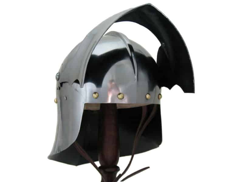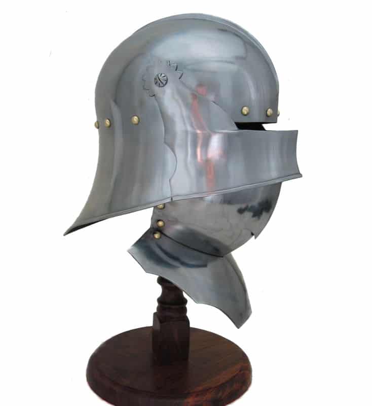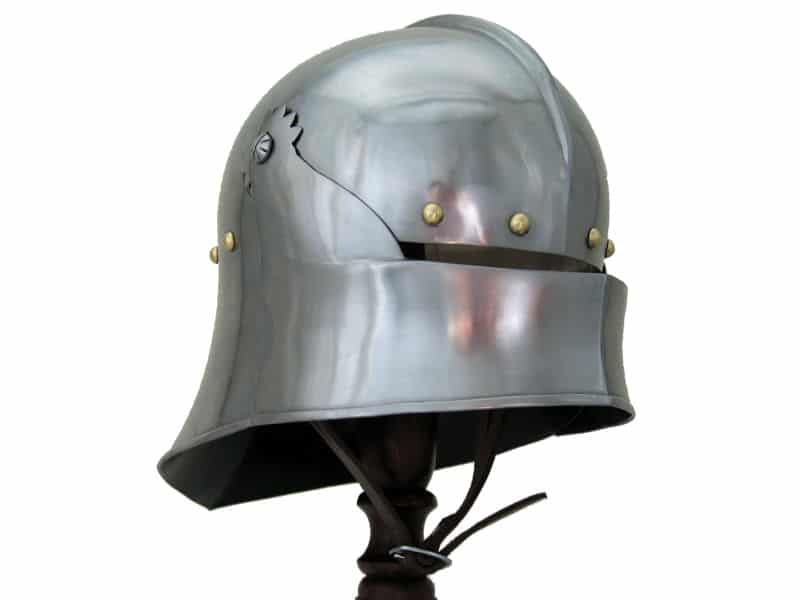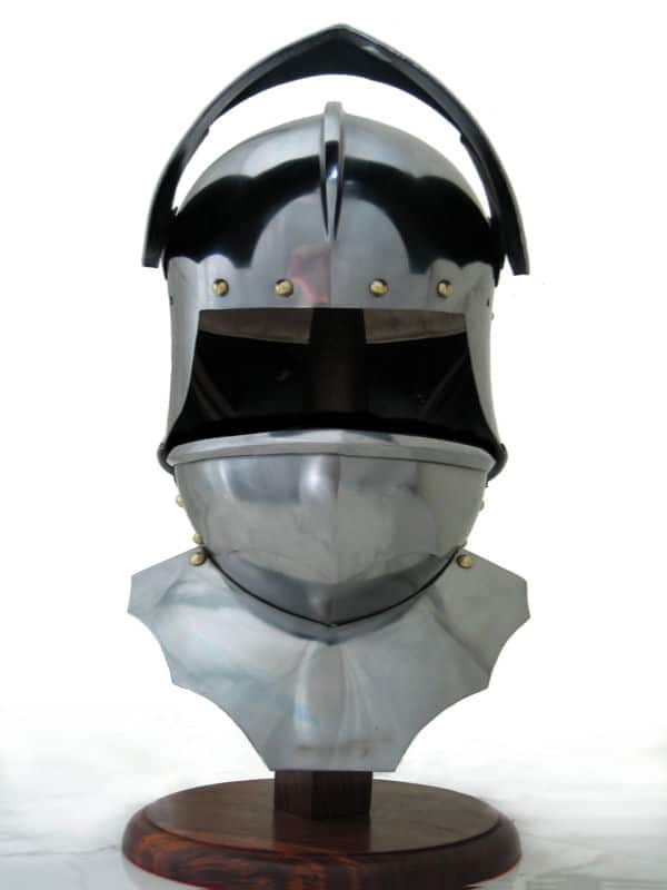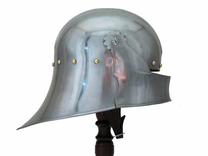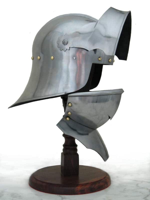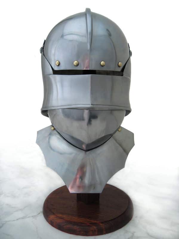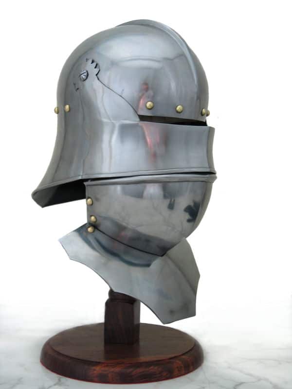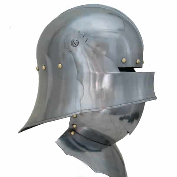 Suitable for foot or mounted combat, this two-tiered helmet was prized by both knights and men-at-arms. The Salade, or English Sallet, possibly originated from France or Burgundy. It was constructed with a tail to protect the back of the head and neck. This version sits flush on a bevor, which protects the chin and throat. The original is believed to be English and dates from about 1480. The Salades were a common sight on the battlefields of the Wars of the Roses, worn by knights as well as other soldiers. Our replica features the moveable visor and a bevor with falling buff like the original. Bevor can be fixed to two different heights.