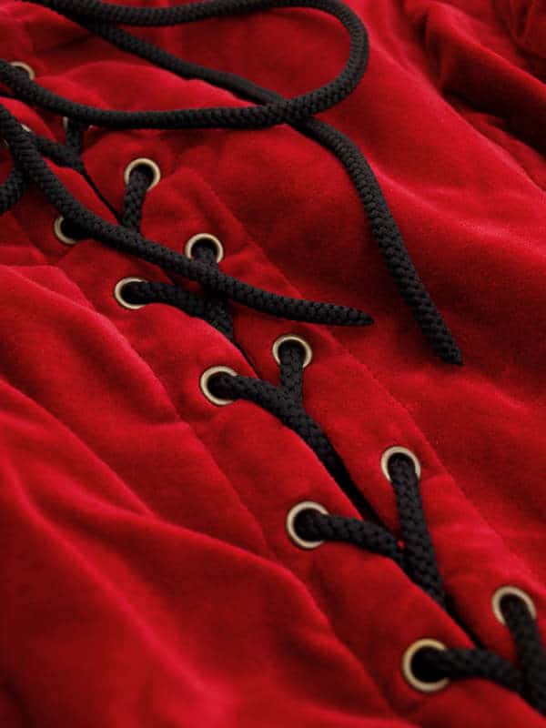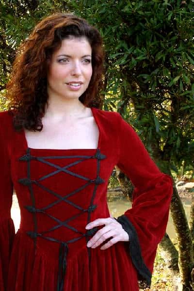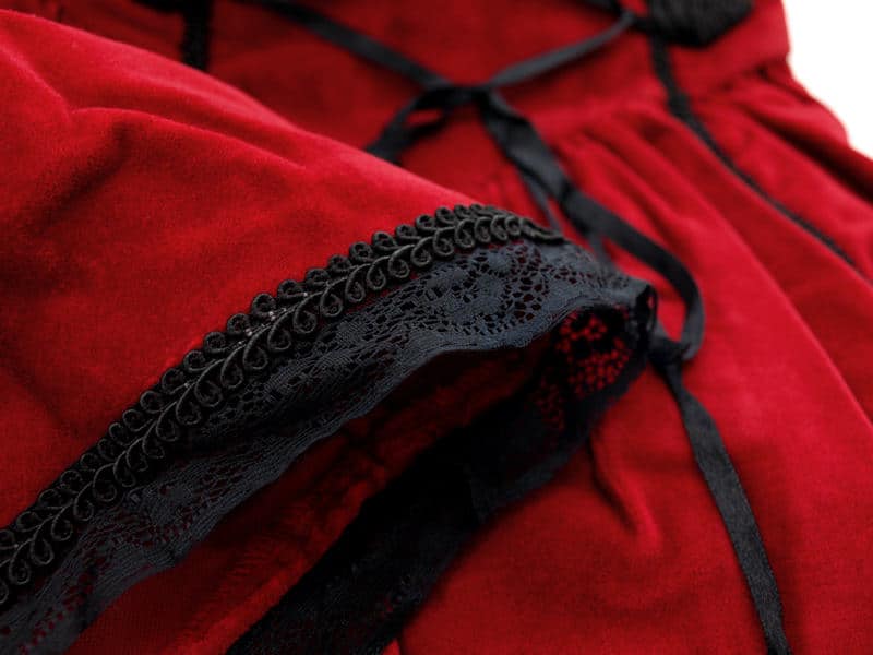 You will feel like you’ve stepped into the pages of a fairy tale when you wear this elegant gown. Made of heavy, red 100% cotton velvet, the dress has full bell sleeves and a generous full skirt. Sleeves are lined with black lace and the lace-up front is complimented with rich decorative embroidery. Dress can be tightened to a close fit with the back laces.