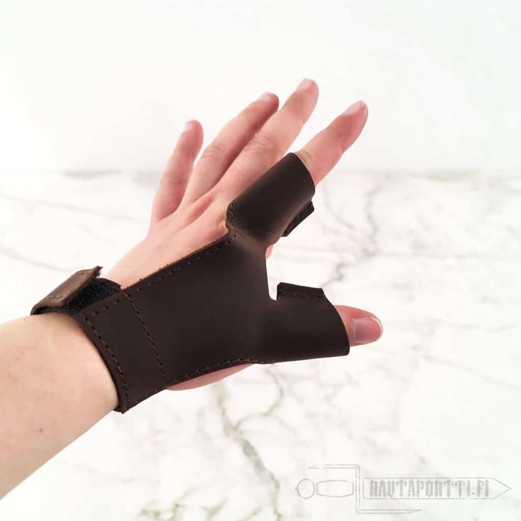 A shelf glove is a protective glove worn on the hand that holds the bow in archery. It has a smooth surface where the arrow rests before shooting. This smooth surface reduces friction between the arrow and the hand, ensuring a clean release and improving accuracy. Additionally, the shelf glove protects the hand from discomfort, abrasions and potential injuries caused by contact with the arrow and fletchings during the shooting process. As the arrow is released from the top of your hand, the arrow shaft and fletchings scrape your hand with every release.
