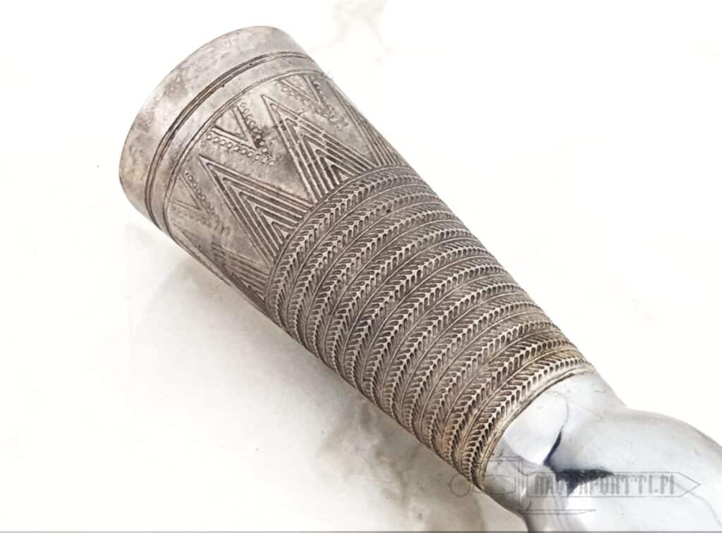 Hanwei’s decorated spearheads, designed by Paul Chen, demonstrate the Vikings’ creative mix of art and war, whereby weapons often carried intricate patterns which were created by using the niello process. This involved using an alloy of several metals (notably silver) mixed with sulfur, which was rubbed into an incised pattern and then fired. Where the alloy had been rubbed into the engravings, it would remain black, while the rest of the surface would be polished to a bright finish. The decorating process used at Hanwei involves a little less alchemy but still provides a lustrous, permanent niello-like effect.