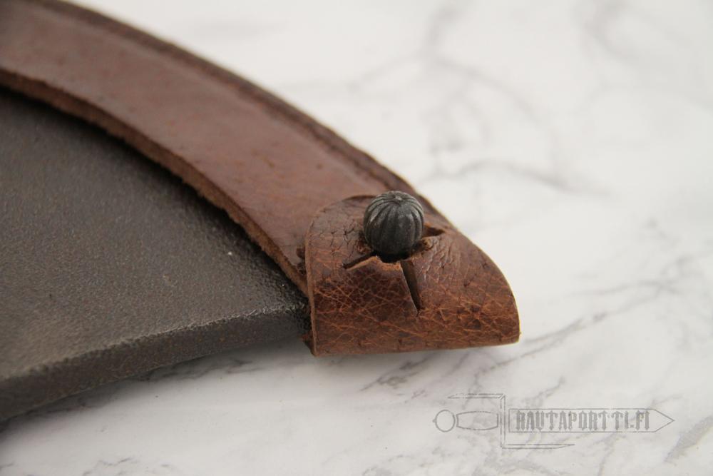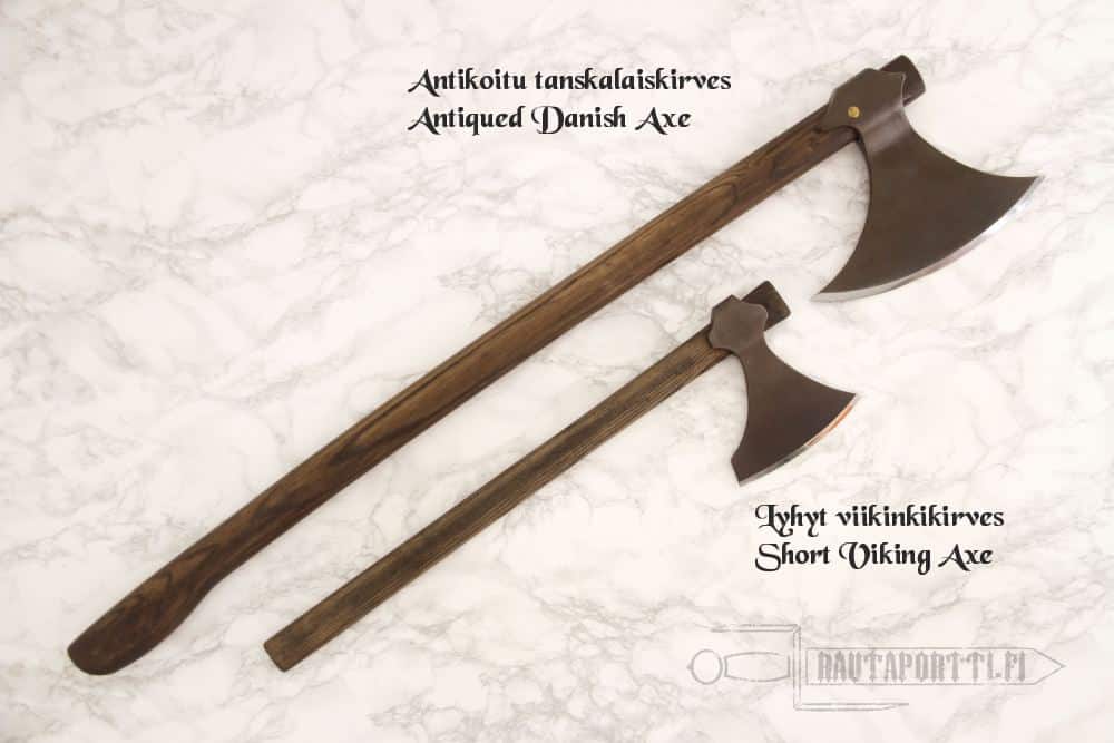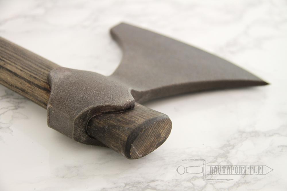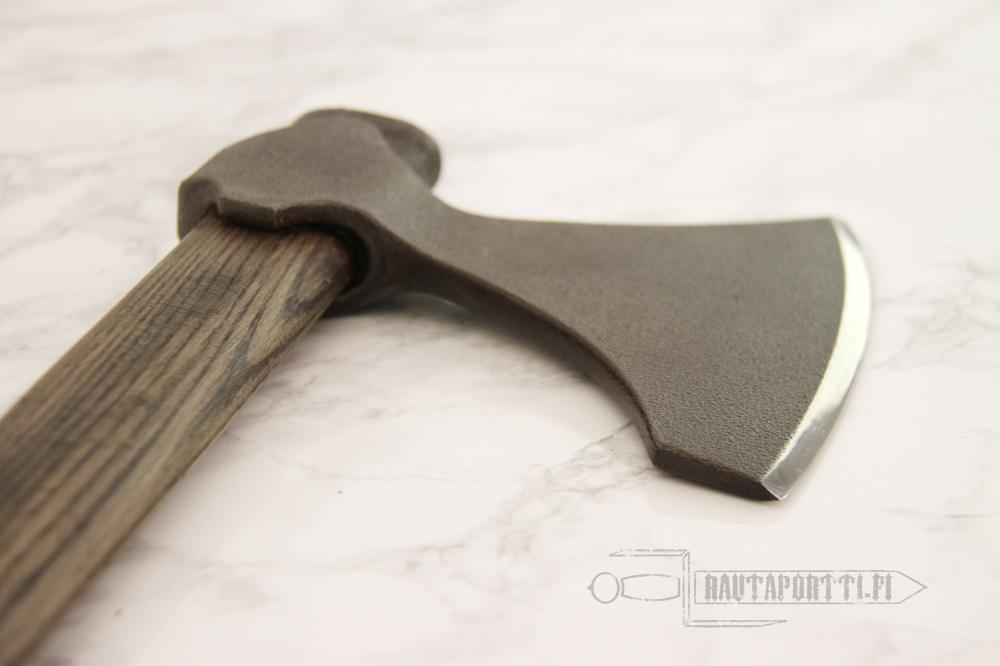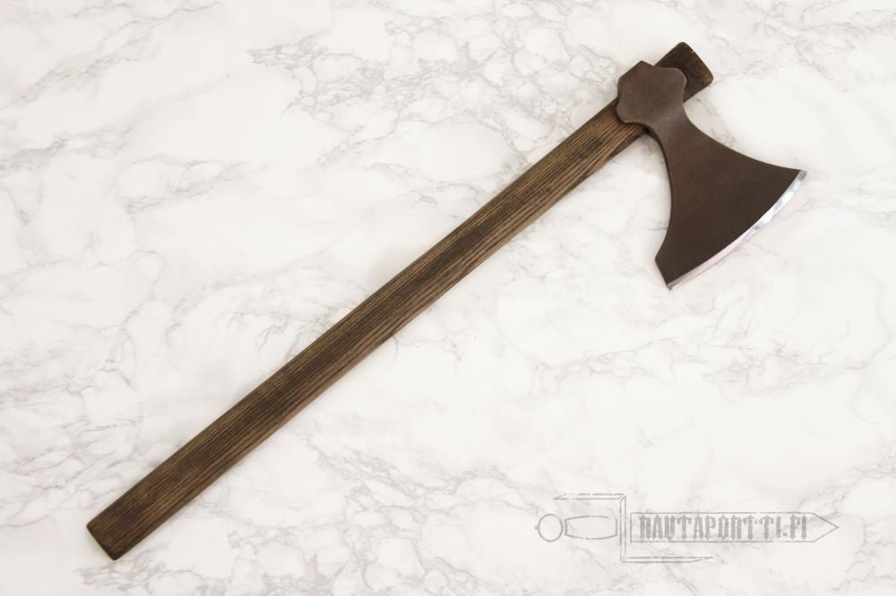 This short Viking axe excels as a one handed weapon but is made to withstand throwing, with the steel head having hardened edges. The axe is well balanced and competition approved. The blade is medium wedged, so it can withstand being used as a tool, but is not solely meant as one. The more wedge shaped an axe head is, the more it is geared towards use as tool, and the thinner and flatter it is, the more likely it is meant as a weapon. Something like this was useful both on the farm and in battle and being relatively small and light it travelled easily wherever the ancient farmer/warrior went.
