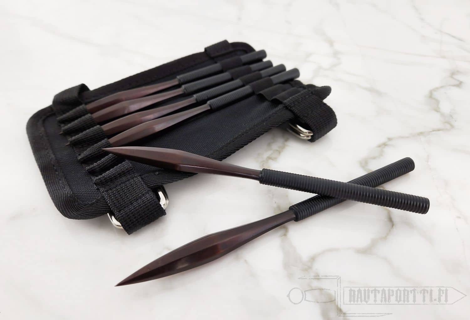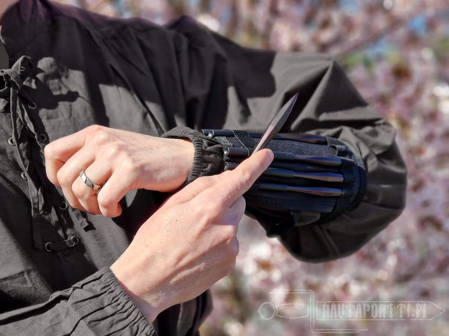 Shuriken were sometimes coated with poison to enhance their effectiveness, allowing even minor wounds to incapacitate or kill an opponent. This tactic highlighted the stealth and cunning of the ninja. Shuriken could also be embedded in the ground as traps, hidden in strategic locations, or used in hand-to-hand combat as makeshift daggers. This Shuriken set contains six darts in a forearm band made of cordura. The darts are plated black in the Ninja tradition.