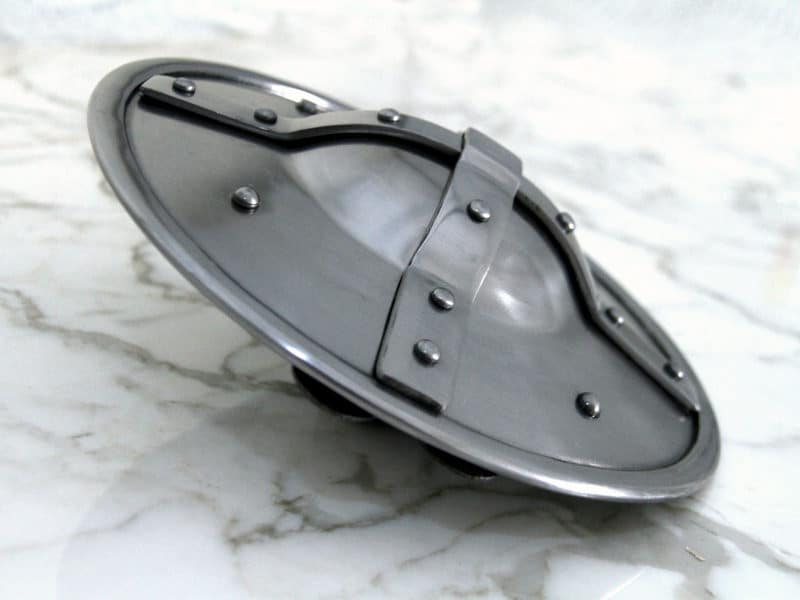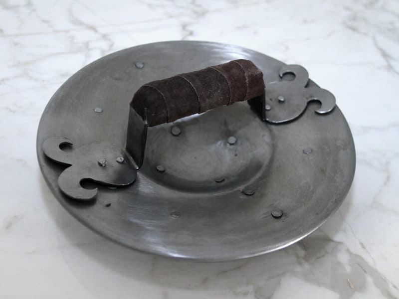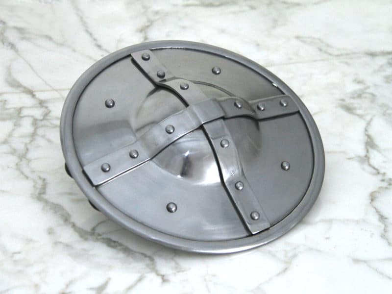 This round buckler has been strengthened with two steel bands that cross over the shield. This buckler is made from 2 mm thick steel and has been designed for re-enactment combat use.