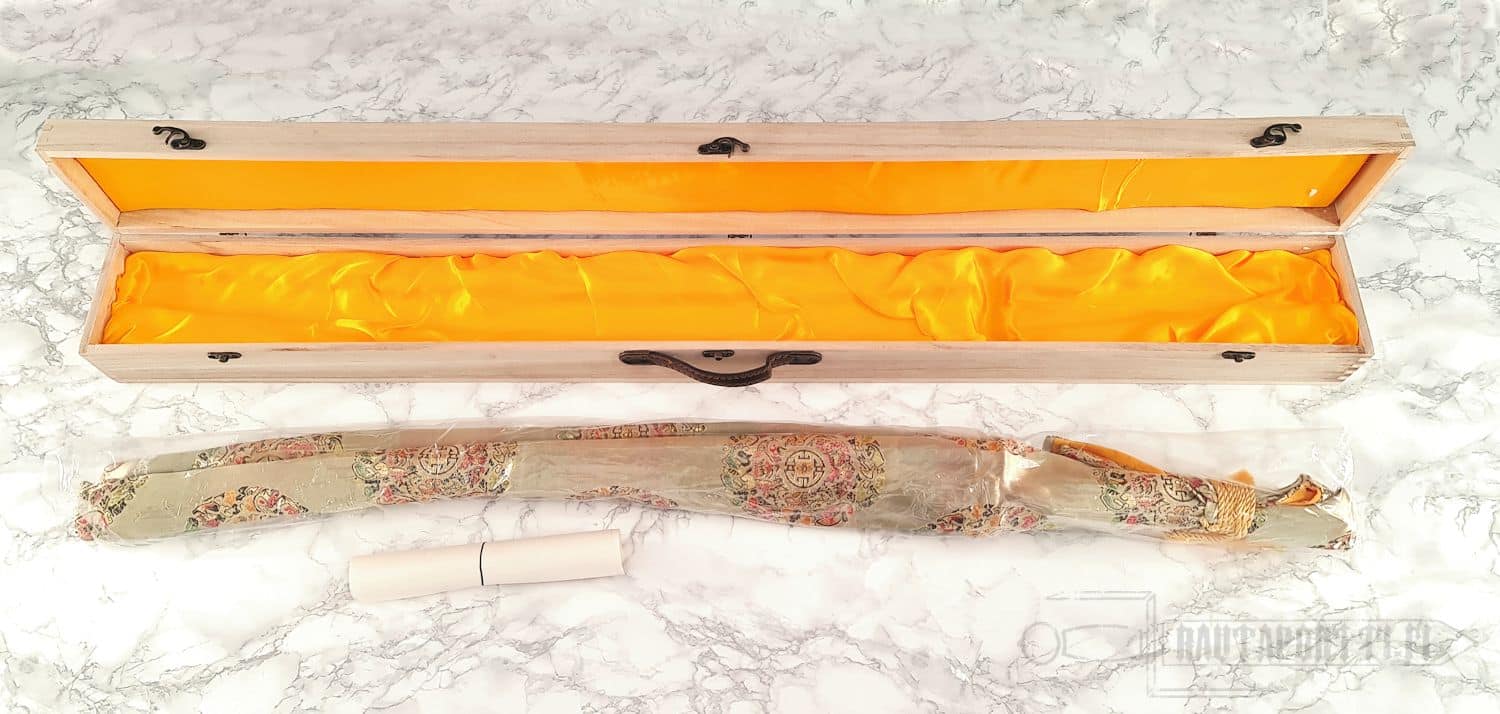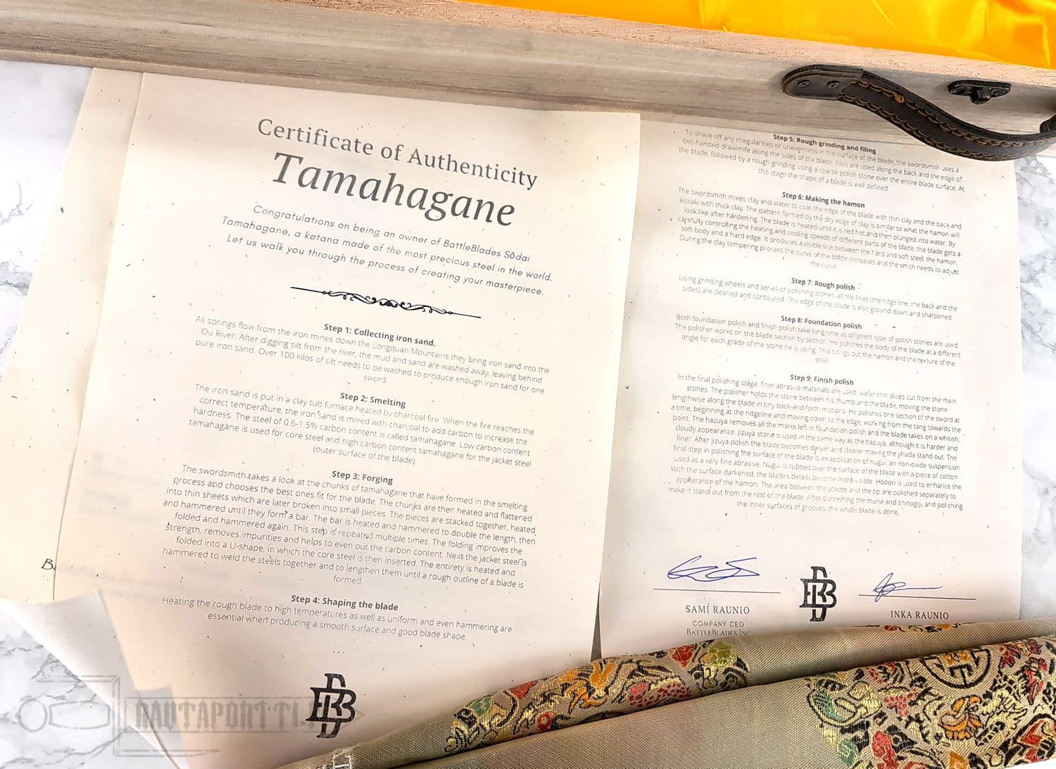 Sōdai Tamahagane handmade katana comes in a branded wooden box with an embroidered BattleBlades Inc. silk sword bag and a serial numbered certificate of authenticity, as well as an additional certificate of authenticity.