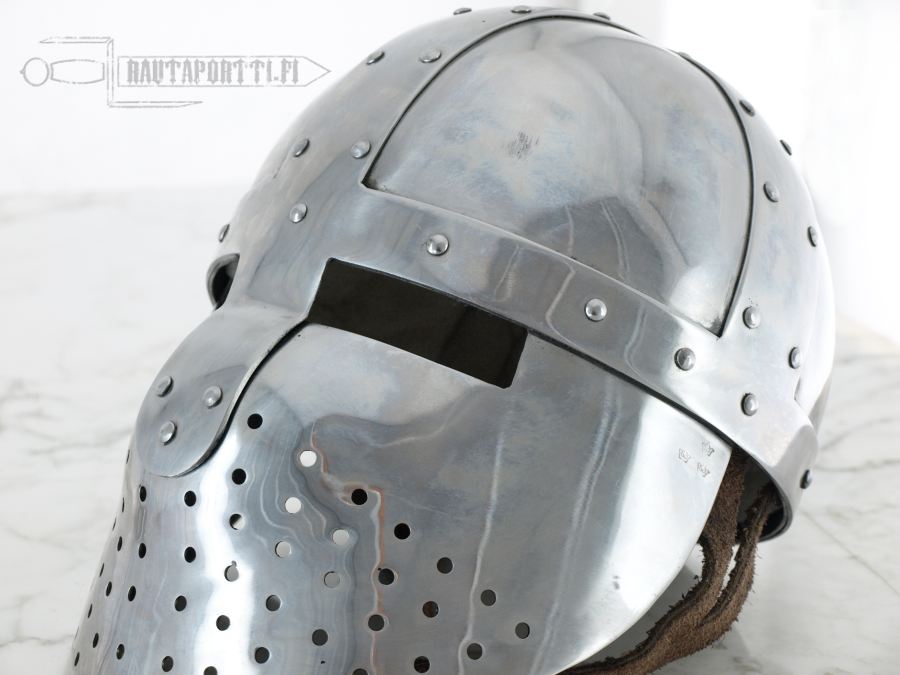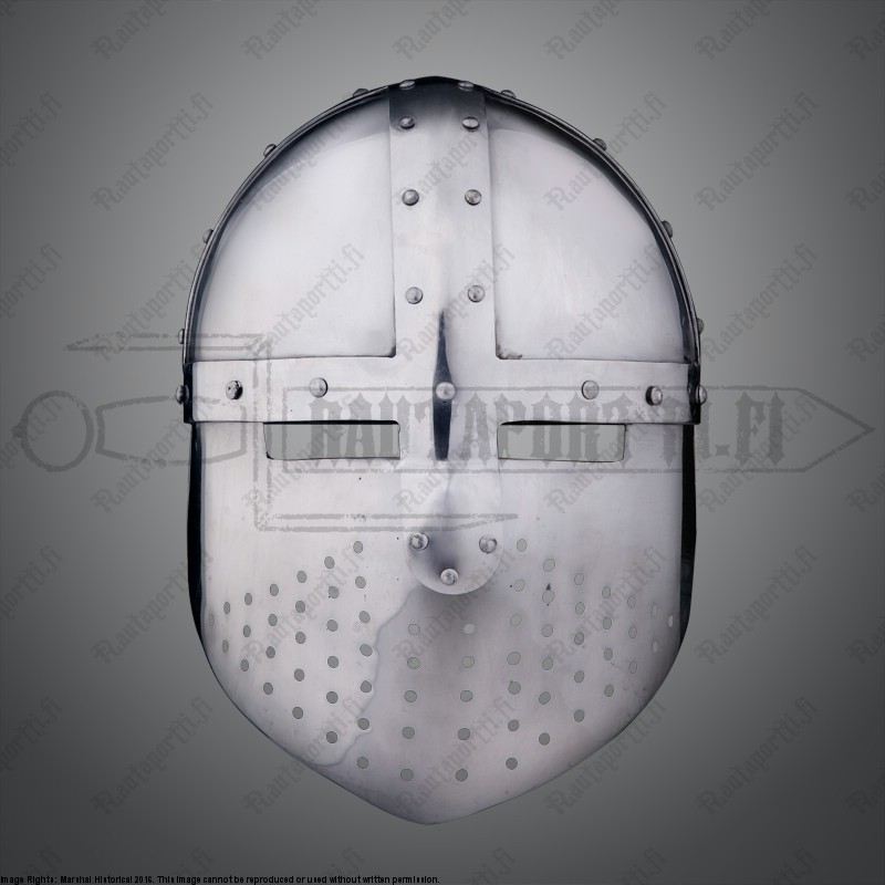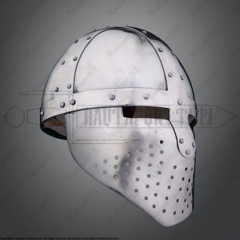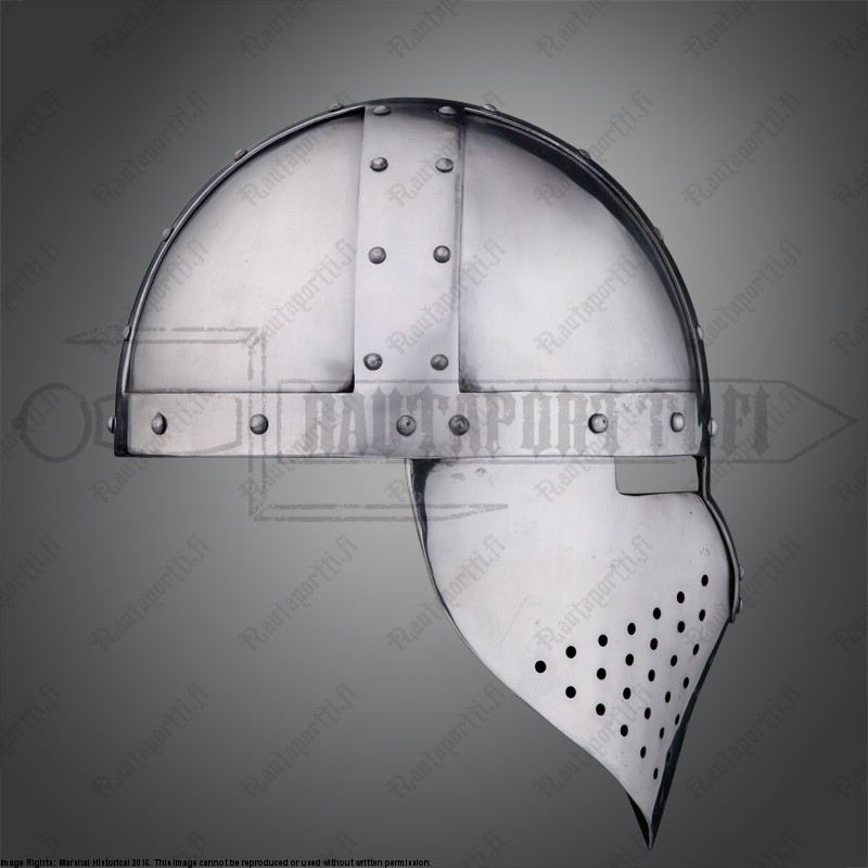 This helmet type was in use from the mid 12th century to the 13th century An example of this type of helm with a pierced facemask can be seen on a stonecarving in the church of St. Justina in Padua, Italy Leather chin strap and light padding included Available in two sizes: size M and size L Weight: 2.6 kg Material: Framework and noseguard 2,5 mm steel, bowl 1,6 mm thick steel