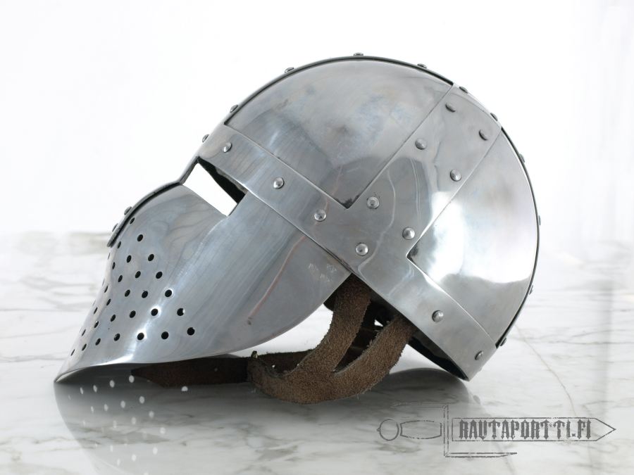 This helmet type was in use from the mid 12th century to the 13th century. As the mask protected the face relatively well in a melee it was popular among infantry, although worn by horsemen too. An example of this type of rounded helm with a pierced facemask can be seen on a stonecarving in the church of St. Justina in Padua, Italy. This helmet-type is an important step towards the eventual great helms of the 13th and 14th centuries, where protective plates were added also to the backside and sides of the helmet.