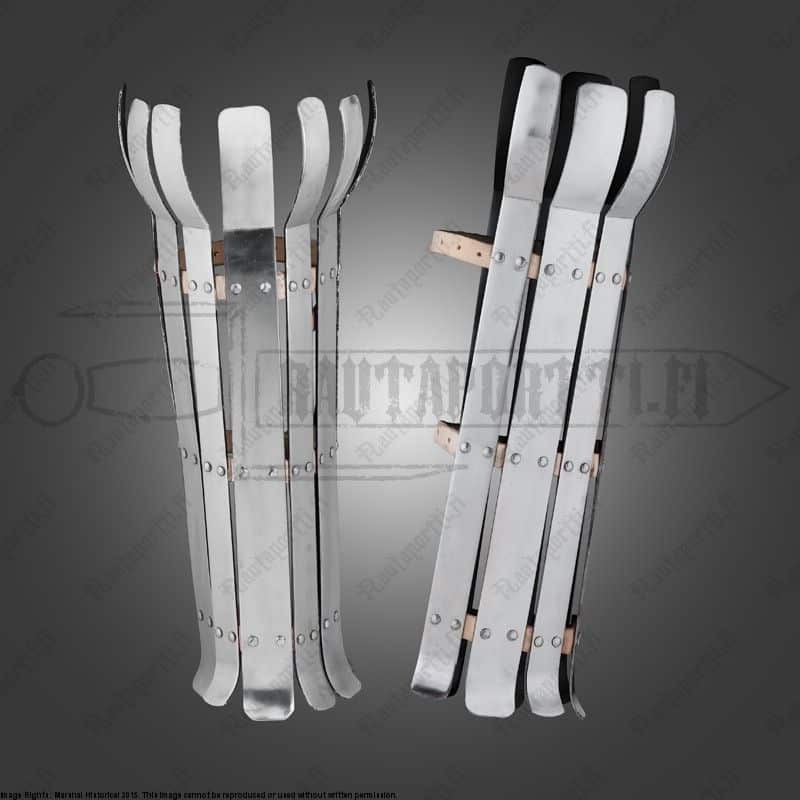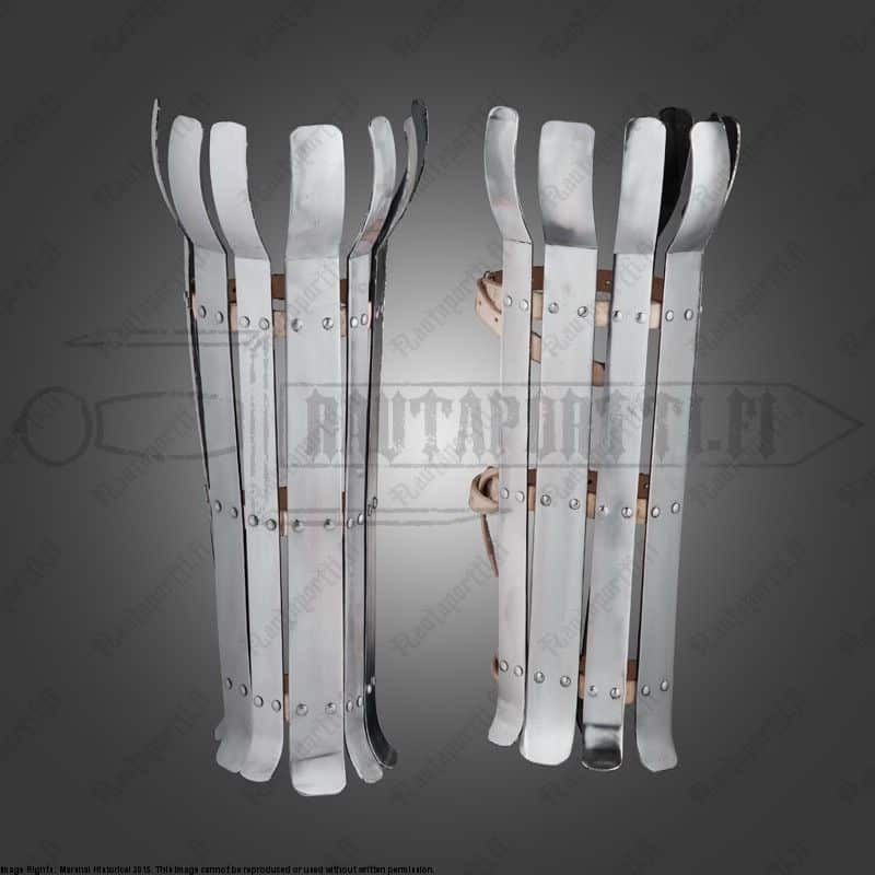 Splint armor, mainly used in greaves and vambraces, consists of narrow and longitudinal metal splints attached to a leather backing. The splints are pierced for riveting or sewing to the leather. The earliest archeological find of splint armour is from 5th century CE of Scythian origin. It was most commonly used in Europe only from the 14th Century onwards, but curiously it makes an appearance already during the Swedish Vendel Era.