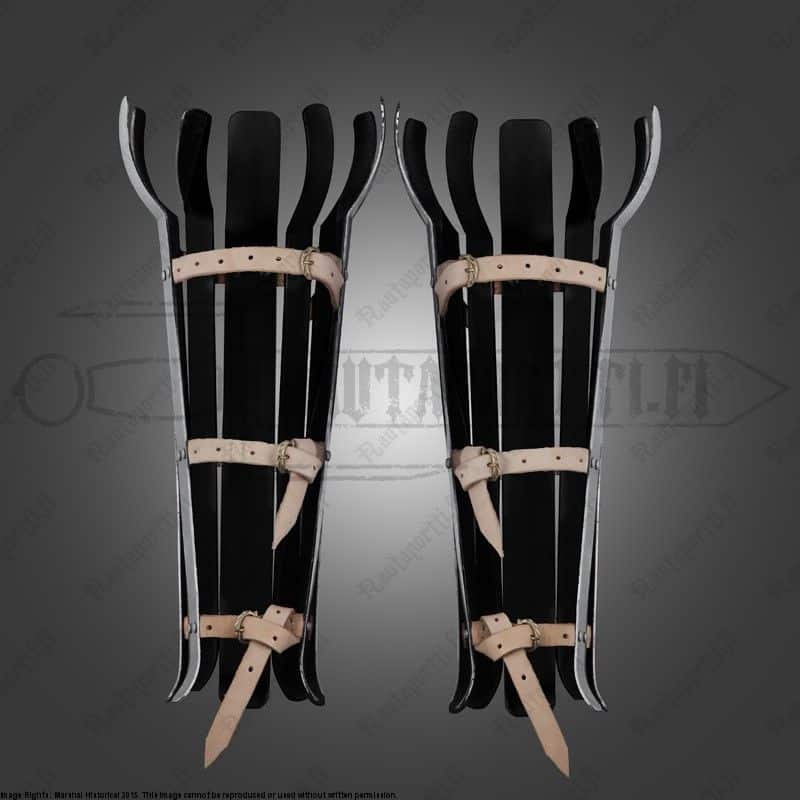 These splint-greaves offer a fantastic way for a warrior to protect their shins without adding a lot of extra weight to the legs. Although inspired by the Vendel Era Valsgärde 8 find, these splint-greaves have been left plain and not decorated with the dragon motifs of the originals, so that they are historically accurate for a very long period, from dark age warriors, through the Varangians and into medieval knights.