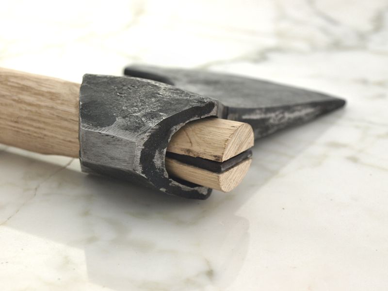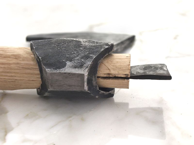 A useful piece for shafting axe heads or hammers properly. Tightens and locks in your axe -or hammerhead- to your wooden shaft. The upper end of your shaft can be splinted or you can hammer the wedge in without splinting the head of the shaft beforehand.