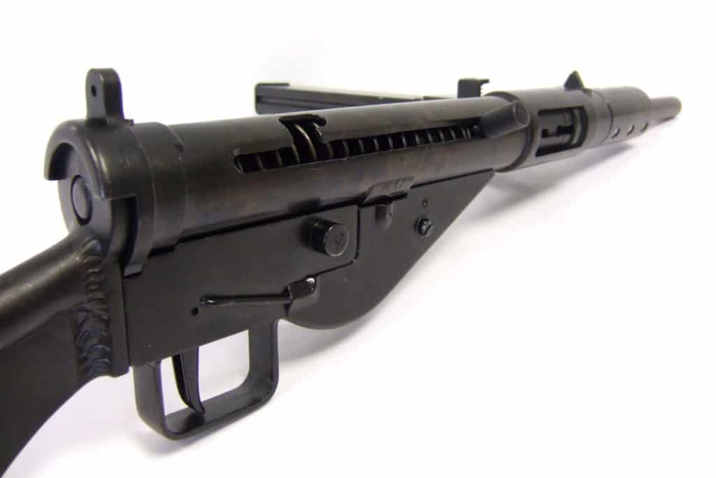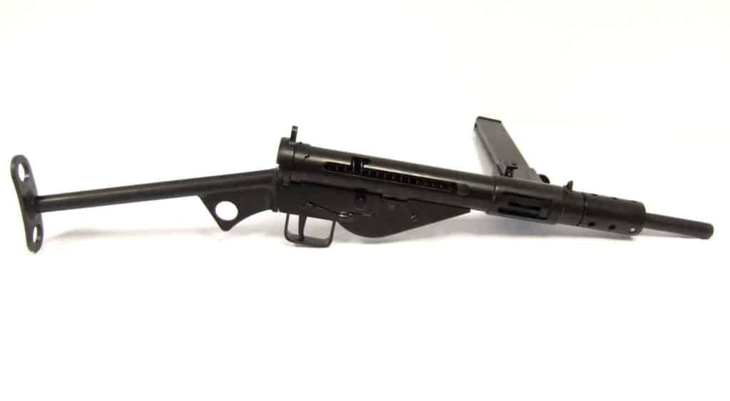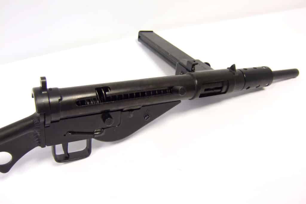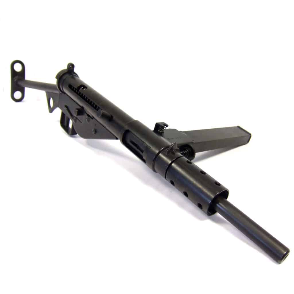 At the outbreak of World War II, there were no submachine guns for military use in Britain, as they were despised as mere weapons for gangsters. As soon as the fighting began, the need for the submachine gun was soon realized, and the design and manufacture began immediately. Britain feared a German invasion of the island, and submachine guns could only be purchased abroad in very small quantities. As can be deduced from the appearance of the weapon, speed and affordability of mass production were the top priorities, at a time when the war was raging and the soldiers were being let down by their weapons. This low-cost submachine gun was produced at best at a paltry 2,5 pounds.
