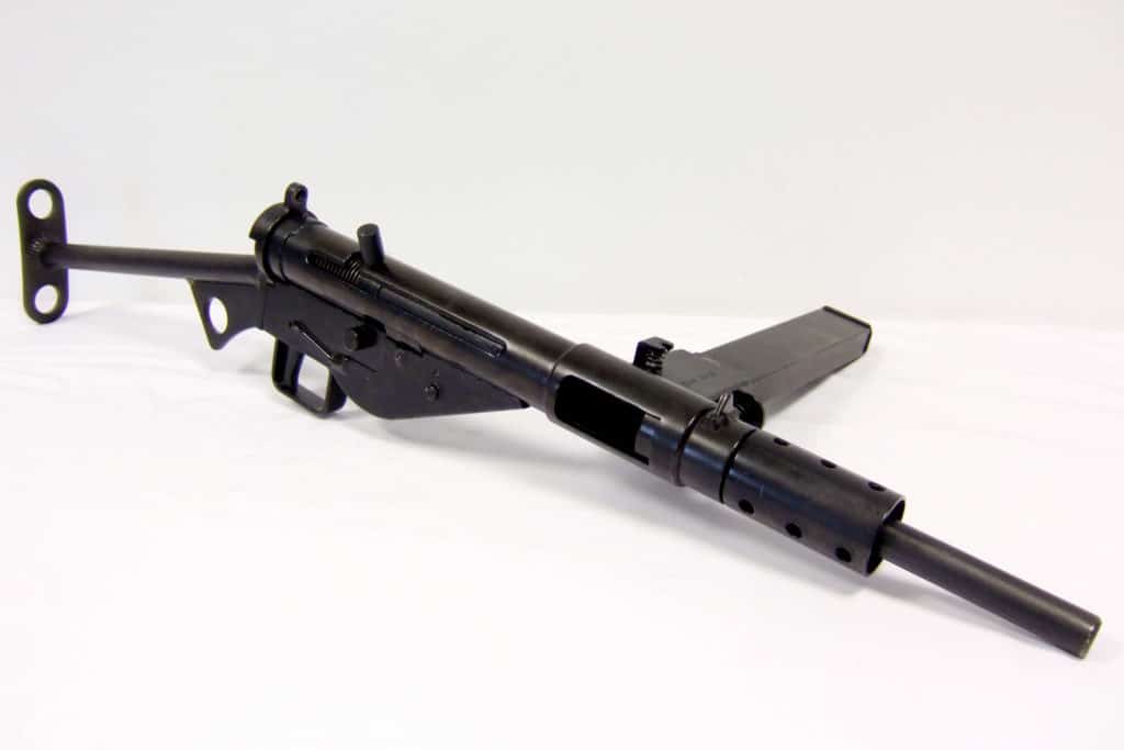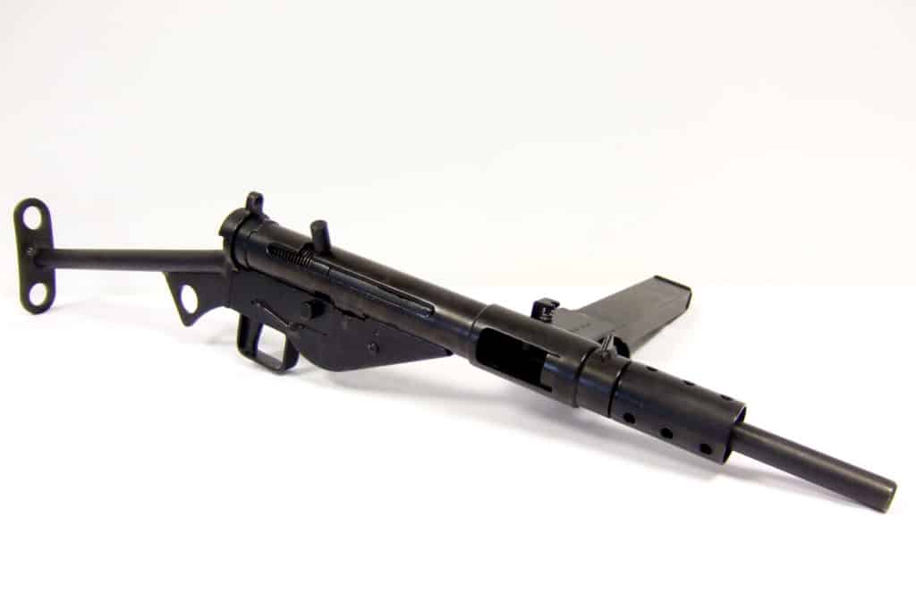 Sten’s submachine gun fires bullets from a 9mm pistol, meaning British troops could fire ammunition won from the Germans. Resistance movements also had easy access to 9mm bullets. The weapon has a fixed sight aimed at a distance of 100 yards, or 91 m.