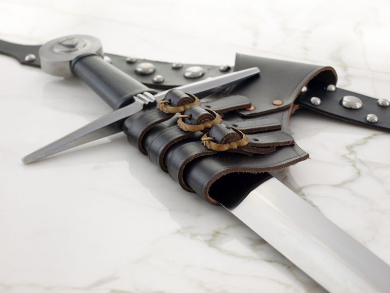 Hand made using dark brown approx. 3mm strong cowhide. Can be used with up to 7 cm wide belts. Fits for scabbards (or LARP-swords) with circumference from 6 to 11 cm but the frog can be easily modified to fit smaller or larger swords also.