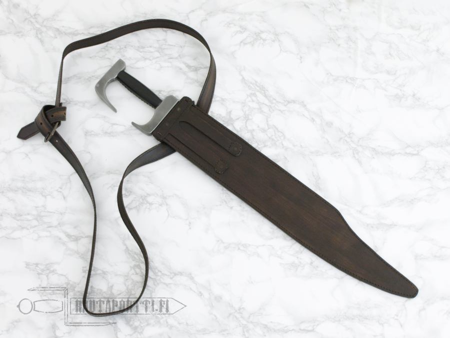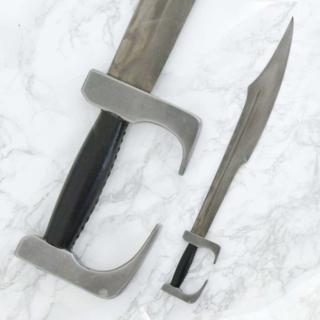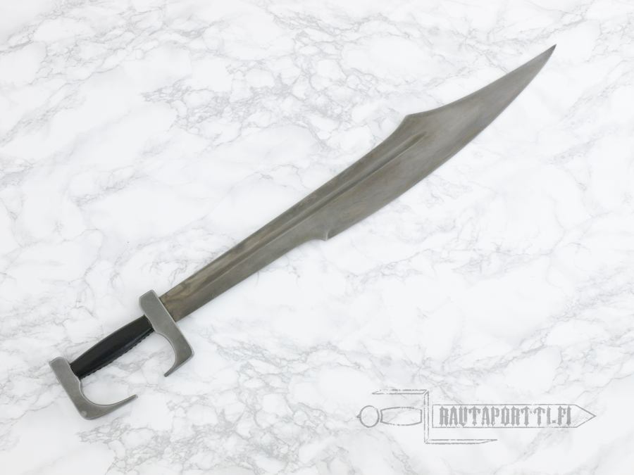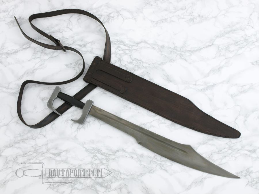 The battle still resonates in the modern era, and has been the subject of many re-tellings since the times of Herodotus. Our sword is a fully licensed Spartan Sword from Frank Miller’s “300”, just as he drew it and envisioned it to be. Direct from the amazing graphic novel and movies with direct consultation with Frank Miller, we bring you a battle ready version. Made of 1095 high carbon steel, it has a hand-forged and well tempered blade with fuller. The sword has a full tang, with traditional peened over construction. The pommel and guard are solid steel. The wooden grip is wrapped with genuine leather. Includes a “battle worn” full grain leather scabbard and baldric. A wicked blade any Spartan would have cherished in battle!
