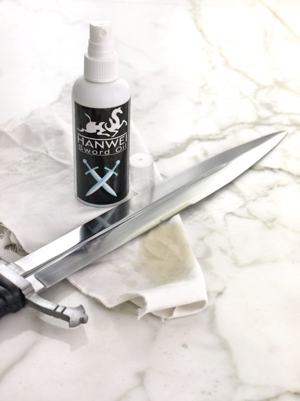 Make sure that your blade is perfectly clean and dry before oiling. Apply a light coat of Hanwei Sword Oil to all exposed steel surfaces, including wire-wrapped grips, using a small piece of fabric. For example a piece from your old T-shirt is good for this use as it is soft and doesn’t leave any lint on surfaces. Gently wipe the oil from the steel surfaces before using the sword to remove any slipperiness and re-oil after use.