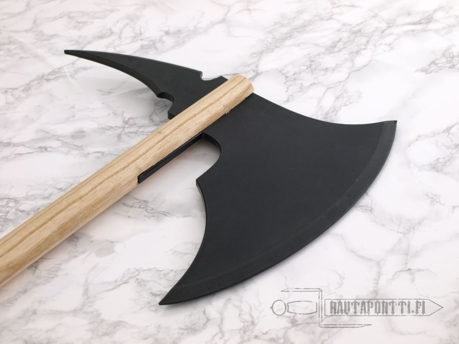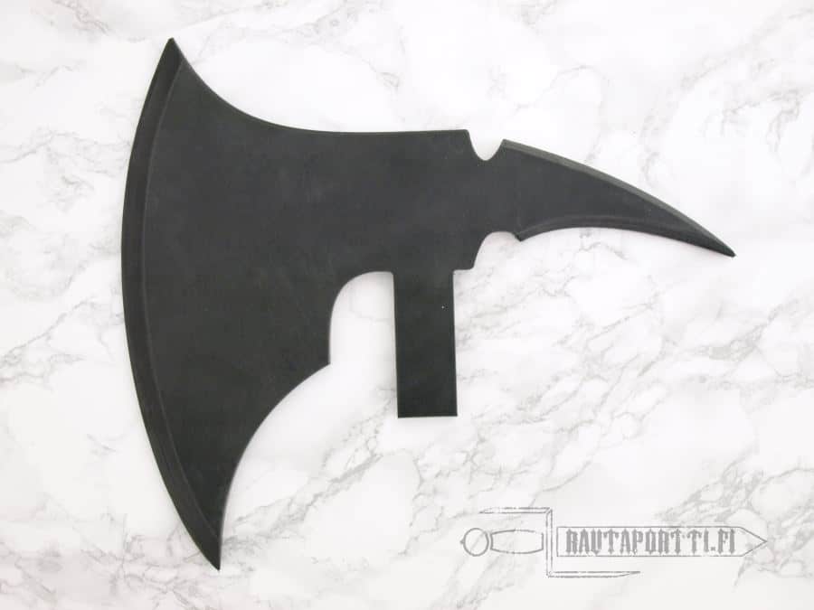 This synthetic weapon simulates battle axes from the medieval times and renaissance. The backspike/hook could be used to pull rider down from their horse or to hook enemy’s weapon, shield or leg. Naturally the spike was also used in attacks to puncture armor and overall to make the axe a more versatile, fearsome and dangerous weapon is the hands of a capable fighter. For the size it is a blade for a two handed battle axe (or for a quite large one-hander).
