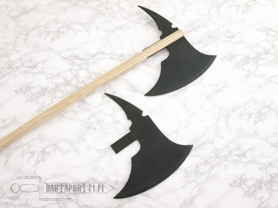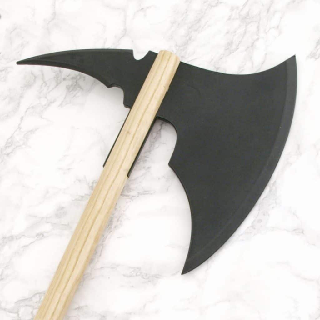 Practice weapons of all kinds always have to balance realism with safety. If the weapon is too realistic it will function like the real weapon and there is a risk of serious and unnecessary injury. If the weapon however is too soft and bendy, it will be useless as a training tool as it will move and act differently from the real deal. The material used in this synthetic axe is polyethylene which is very durable, will never shatter, is lighter than steel and can be attached to a wooden shaft just like the real blades made of steel. Using synthetic material we now have a lighter and safer version of the battle axe that can be used in a martial arts school in single or pair drills, on theater stage or in reenactment battles.