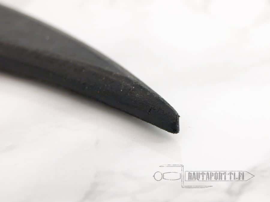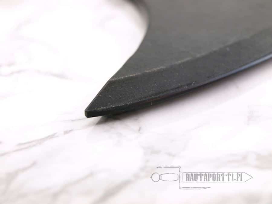 The edges are rounded and the points can be easily filed round if you are planning to use the axe as a tool in active training with a partner. The edge of this axe is softer than steel and lighter making weapon control easier and blows softer with less energy. For sufficient realism, however, the blade has to be firm enough, and not wobble. Therefore even a synthetic blade might cause injury, especially to the face, throat or the eyes, so appropriate protection must be utilized at all times when using this training axe.