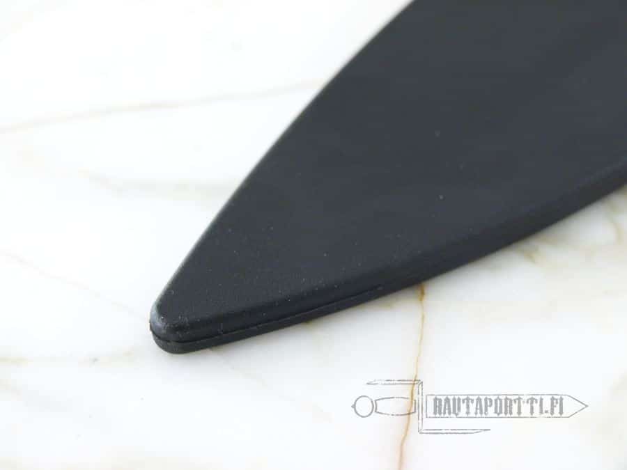 The blade is soft and flexible enough to prevent the likelihood of most bodily injury. The edges are rounded and the point dull. For sufficient realism, however, the blade has to be firm enough, and not wobble. Therefore even a synthetic blade might cause injury, especially to the face or the eyes, so appropriate protection must be utilized at all times when using this training knife.