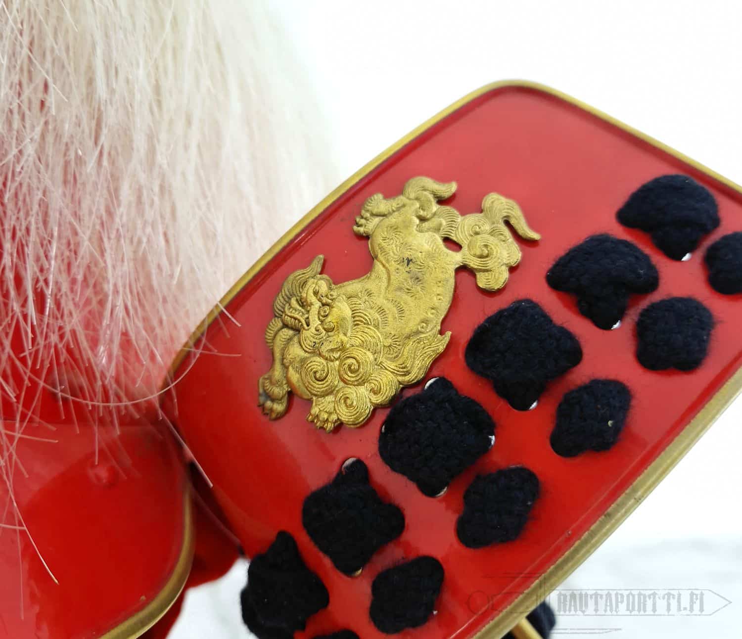 A highlight of this piece is the removable Menpo face guard, complete with a genuine horse hair mustache. The Mempo is attached to the helmet by knotting it into position with the thick helmet cords. Oni Demon with pointy horns is made of solid brass with antique finish and is also removable. Plume on top the the helmet is made of genuine horsehair. The helmet comes with a custom wooden display stand for showcasing.