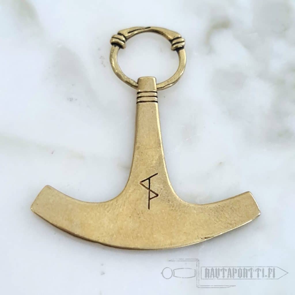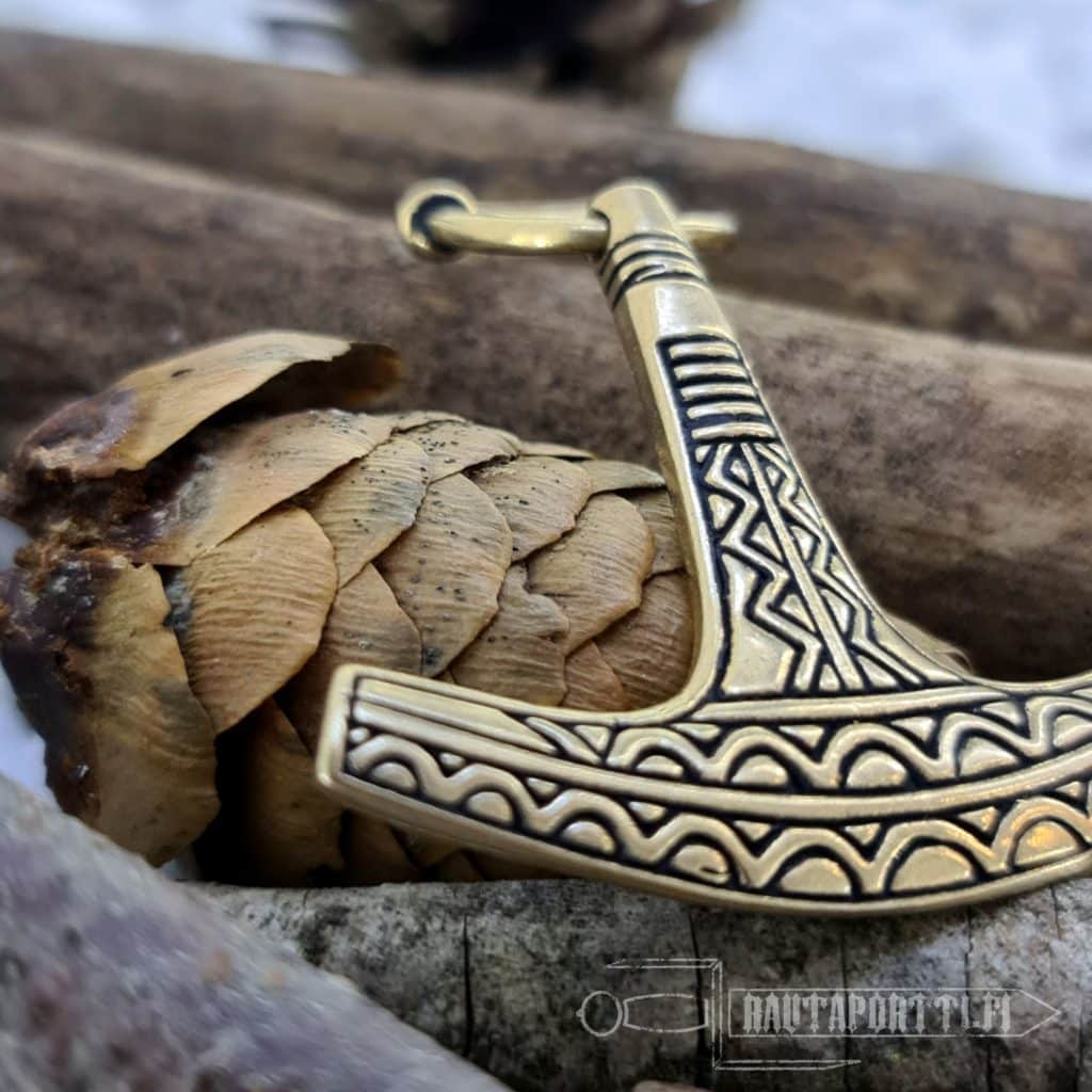 This specific hammer is a detailed replica of a Viking-period pendant from Ylipää / Lieto in Finland. The finding dates to around 800 AD and symbolizes the axe-hammer of Ukko. This pendant is made of high-quality bronze and also available plated with real silver.