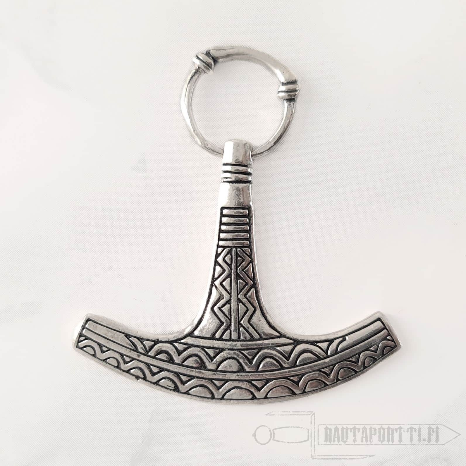 The hammer was commonly worn as a pendant during the Viking Age in the Scandinavian, Nordic and Baltic cultural spheres. Different areas/countries had their own takes on the myths of thunder god, and he is known around northern Europe by multiple different names for example Thor, Perun, Perkunas and Ukko. Ukko is the thunder god in Finnish mythology. He is often depicted as an old, white-haired man, with a flowing beard and broad shoulders with a hammer, axe or sometimes even a flaming sword in hand.