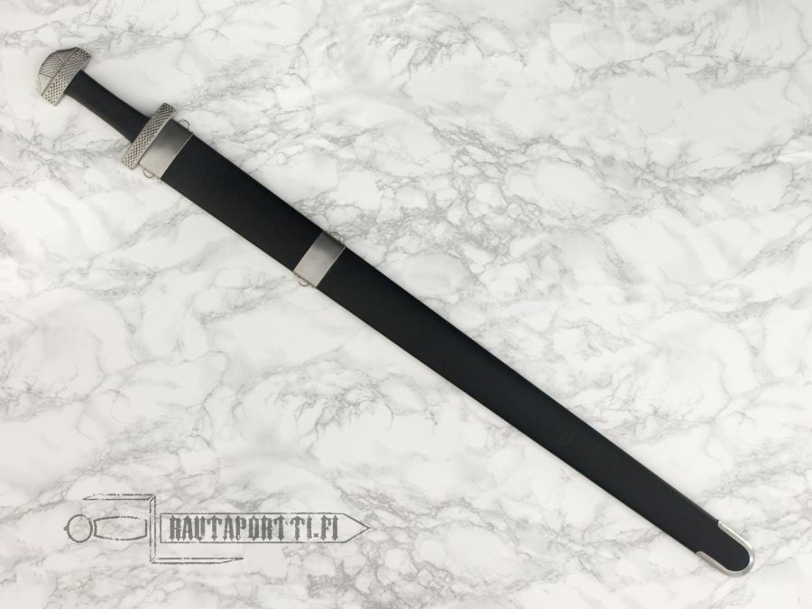As with the rest of the swords in the Tinker line, this Viking sword comes in sharp and blunt versions with identical handling characteristics. The breadth of the sharp version makes for an efficient cutting profile. The blunt version is geared towards the discerning reenactor with 2mm rounded edges. The construction of these Viking swords differs from other swords in the Tinker series as these have peened hilt construction in period fashion to satisfy Viking re-enactment requirements and for a more historical appearance. The wooden scabbard covered in leather has suspension points and a period chape giving the sheathed sword a very attractive appearance.