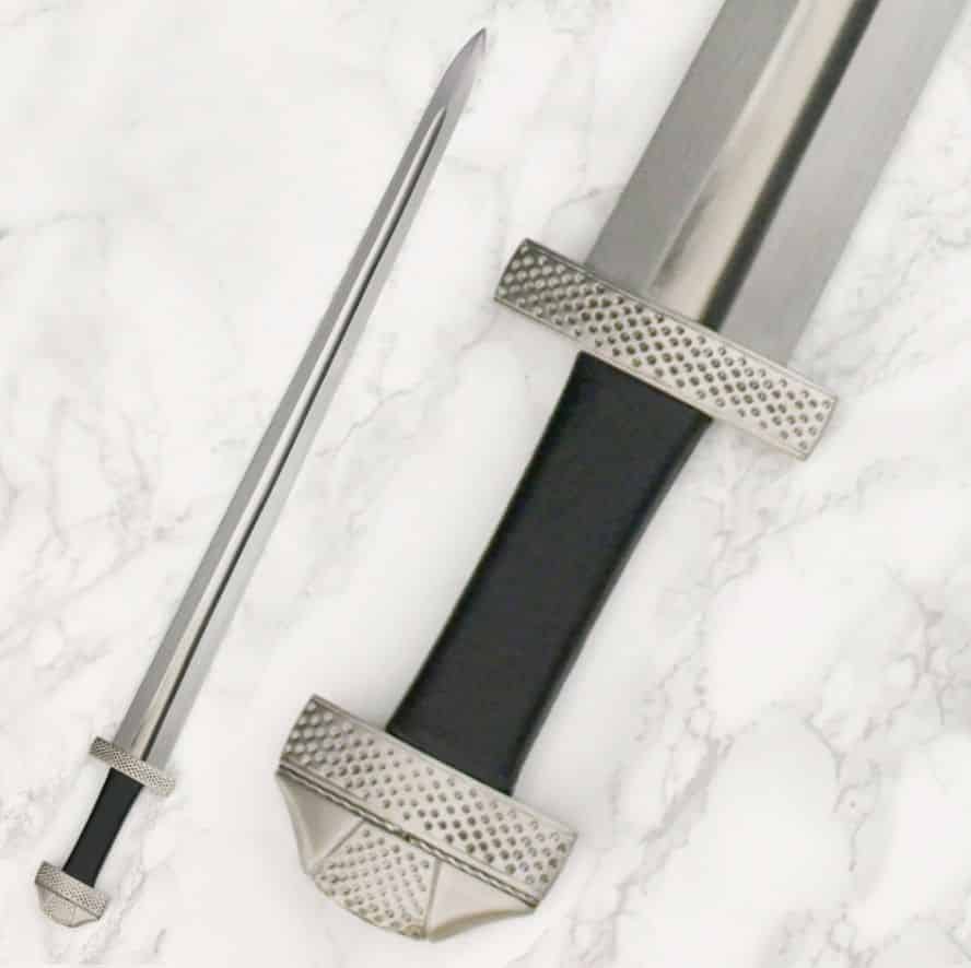 These swords meet Tinkers quality requirements. Each blade is forged from 5160 Spring Steel, and is tempered to a hardness of 50-53 Hrc and the tang to the low 30s Hrc. For the Medieval models the very end of the tang is threaded. The pommel has a recess to fit the hexagonal nut to secure and tighten the hilt. This allows the hilt to be easily dismantled for inspection, customization, and to exchange blades if needed. The sharp and blunt blades are interchangeable on all the medieval models. The blades are intended for full on sparring, but may be replaced if needed, further reducing the long-term cost of these swords. The Viking Sword sharps and blunts are peened for historical authenticity and to meet the needs of collector and reenactment groups.