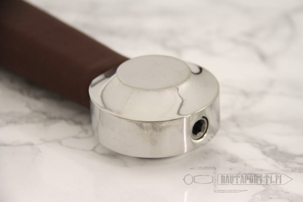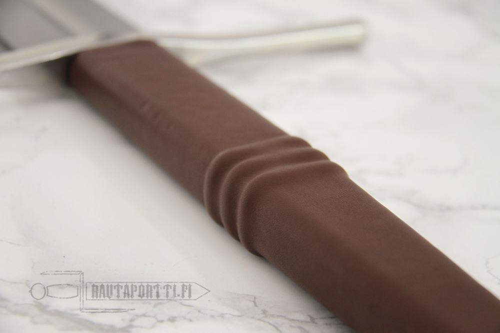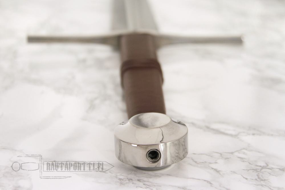 The handle has a wood core covered with leather. The end of the tang is threaded. The pommel has a recess to fit the hexagonal nut to secure and tighten the hilt. This allows the hilt to be easily re-tightened or dismantled for inspection, customization and to exchange blades if needed. The wooden leather covered scabbard is included, and has steel chape and throat.