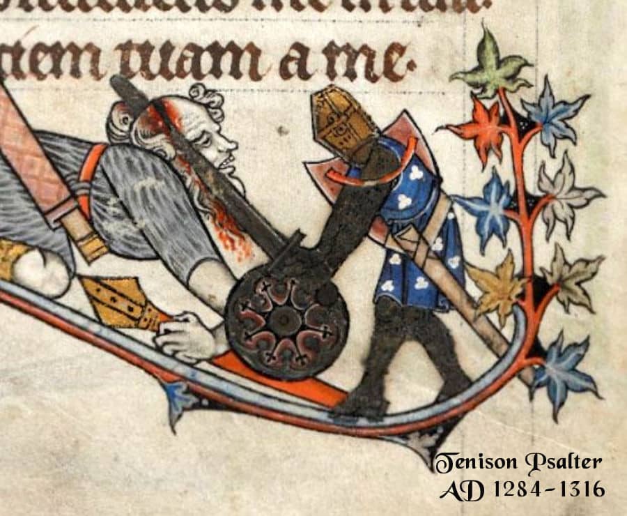 Great Swords of War are generally considered to be of German origin, but there are Spanish and English examples as well. According to the Oakeshott sword typology, they are classified as a type XIIIa, and they first appear during the 12th century and remained popular through the 14thC. Because a large and heavy slashing sword was not the most effective weapon against full plate armor, the popularity and longevity of this sword type proves that not nearly everyone on the battlefield was clad thus. Of course the effects of blunt force from a wide and heavy blade can never be underestimated, but neither can its effectiveness in cutting through gambeson and other textile armor.