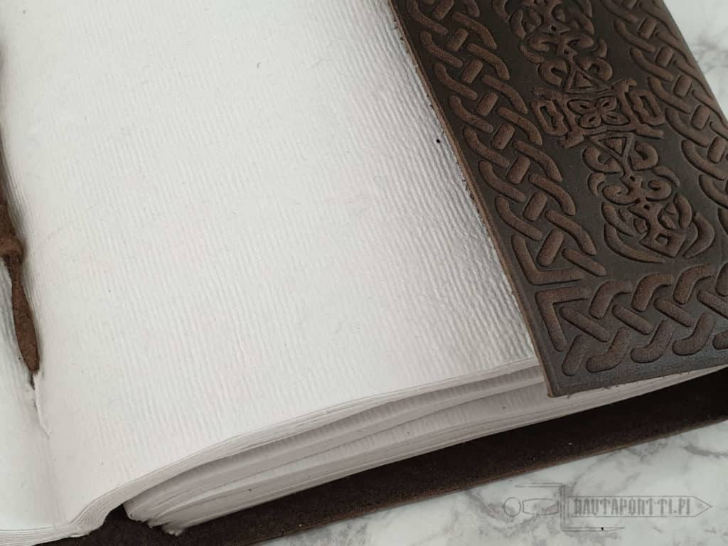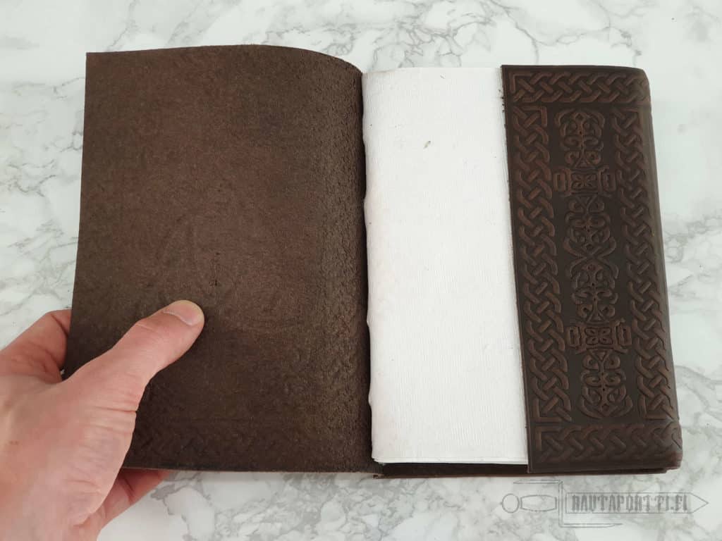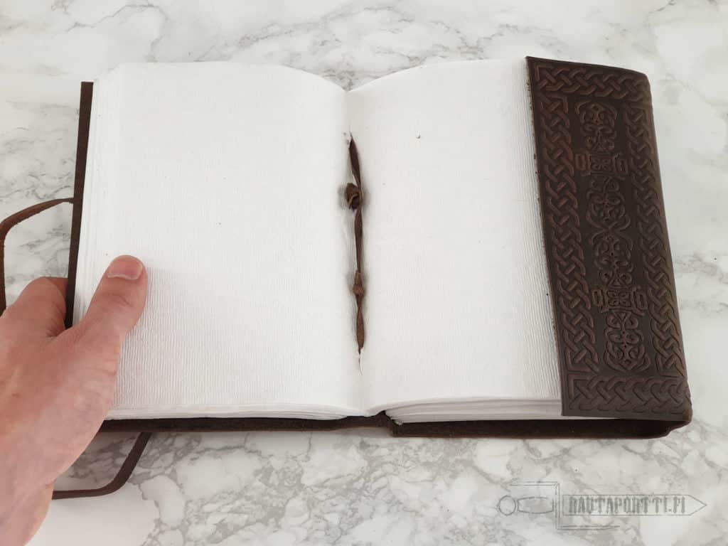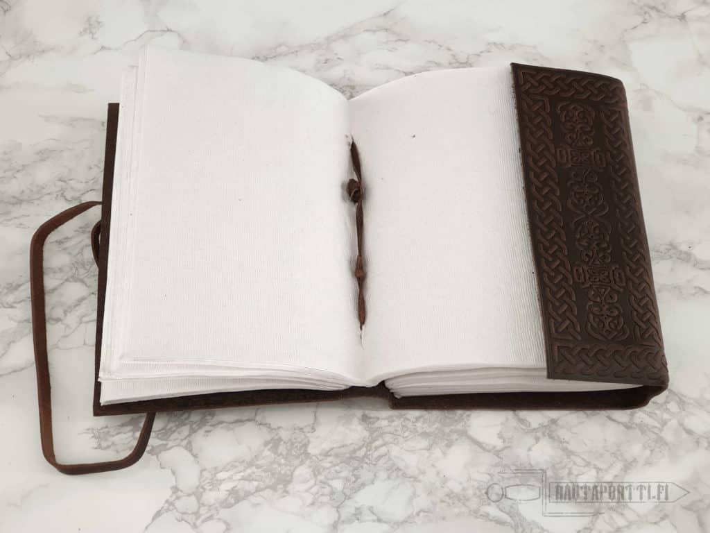 • This book can be closed and tied using a leather strap