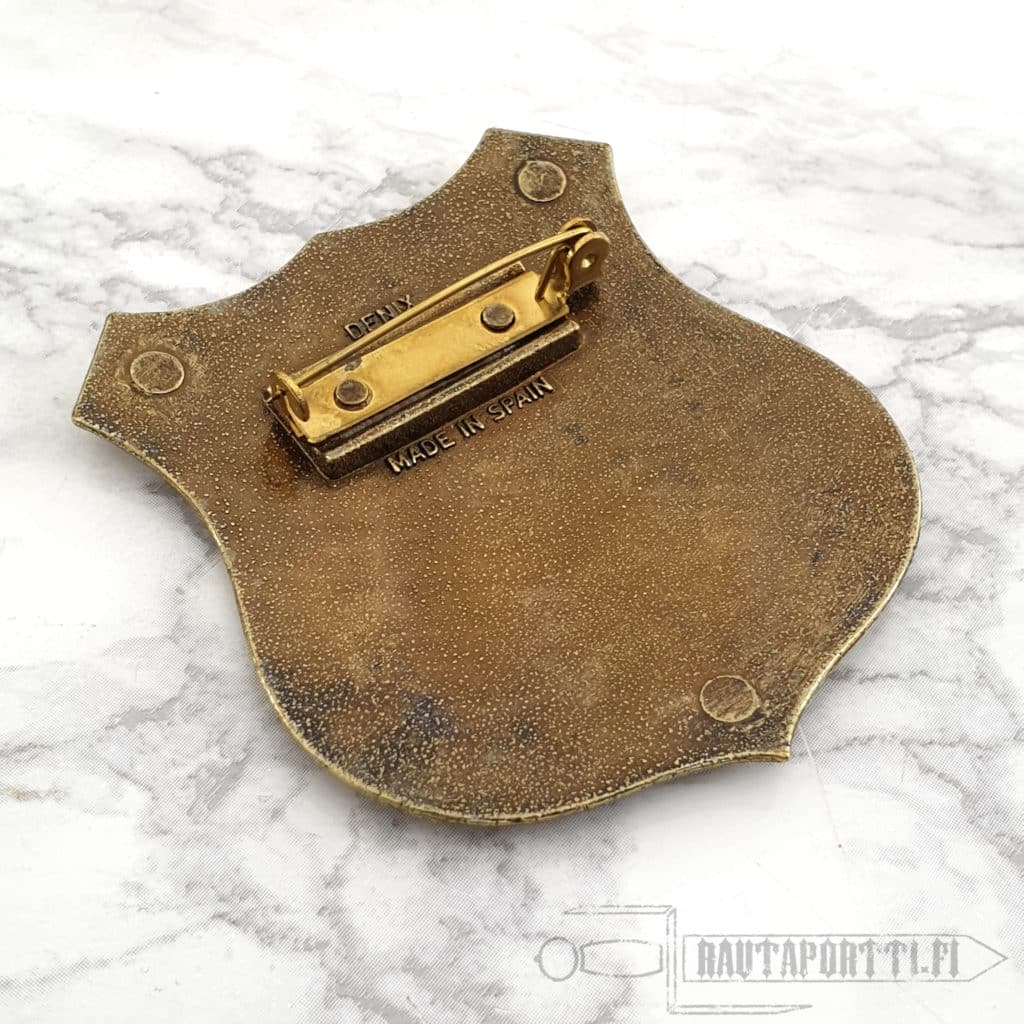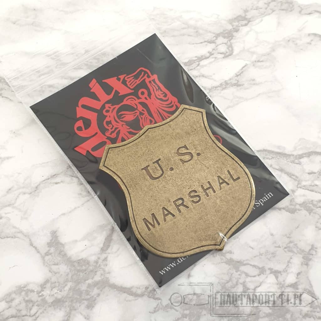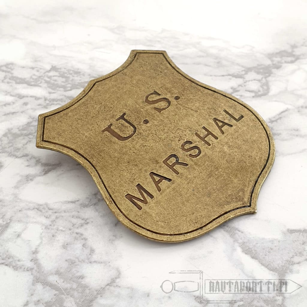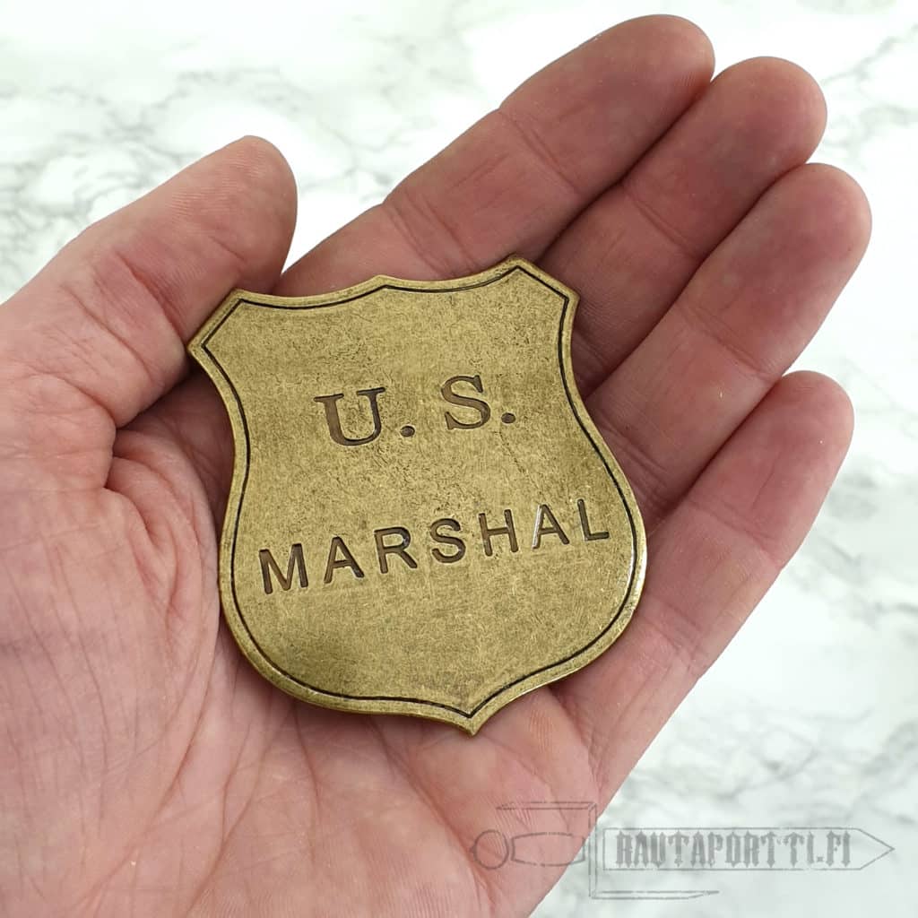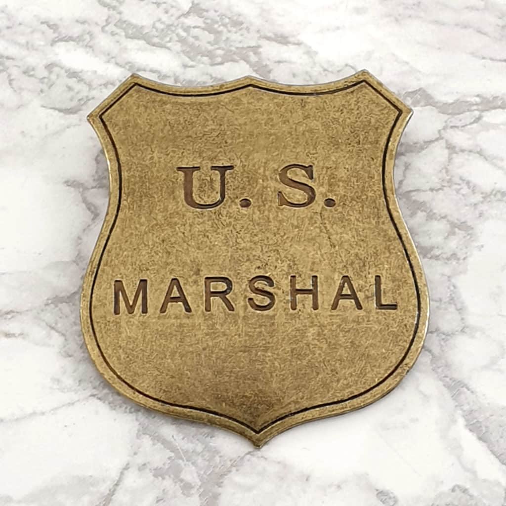 Reproduction of a US Marshal badge made of metal, with a needle for attachment.