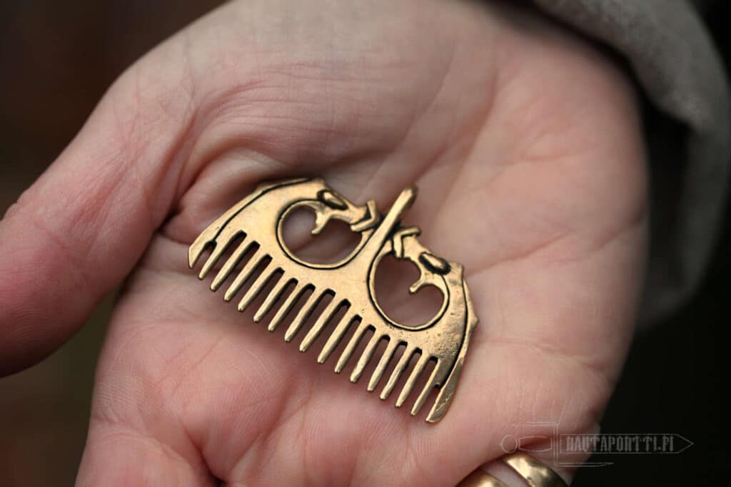 Several models of comb pendants from the Viking Age are known from eastern Sweden and the Baltic States. This bronze beard comb is modelled after a find in the so-called Ringerike style, one of two identical comb pendants from the Viking Age found in England and dating to the 11th century.