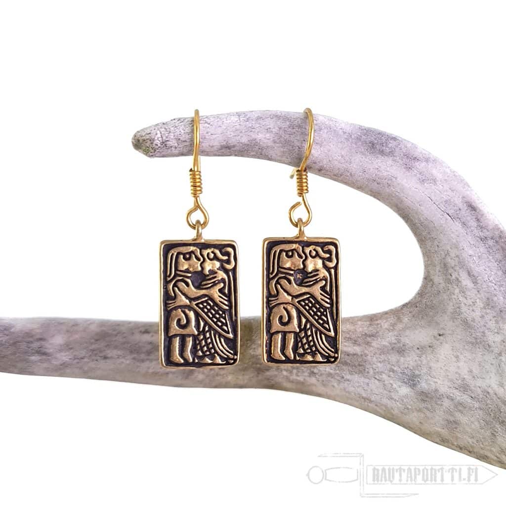 These earrings depict a pair of “Guldgubbe”, one to two centimetre tall figures made of sheet gold and sometimes silver. They appear exclusively in Scandinavia and were very common in the Germanic Iron Age with over 3000 finds in Norway, Sweden and Denmark.