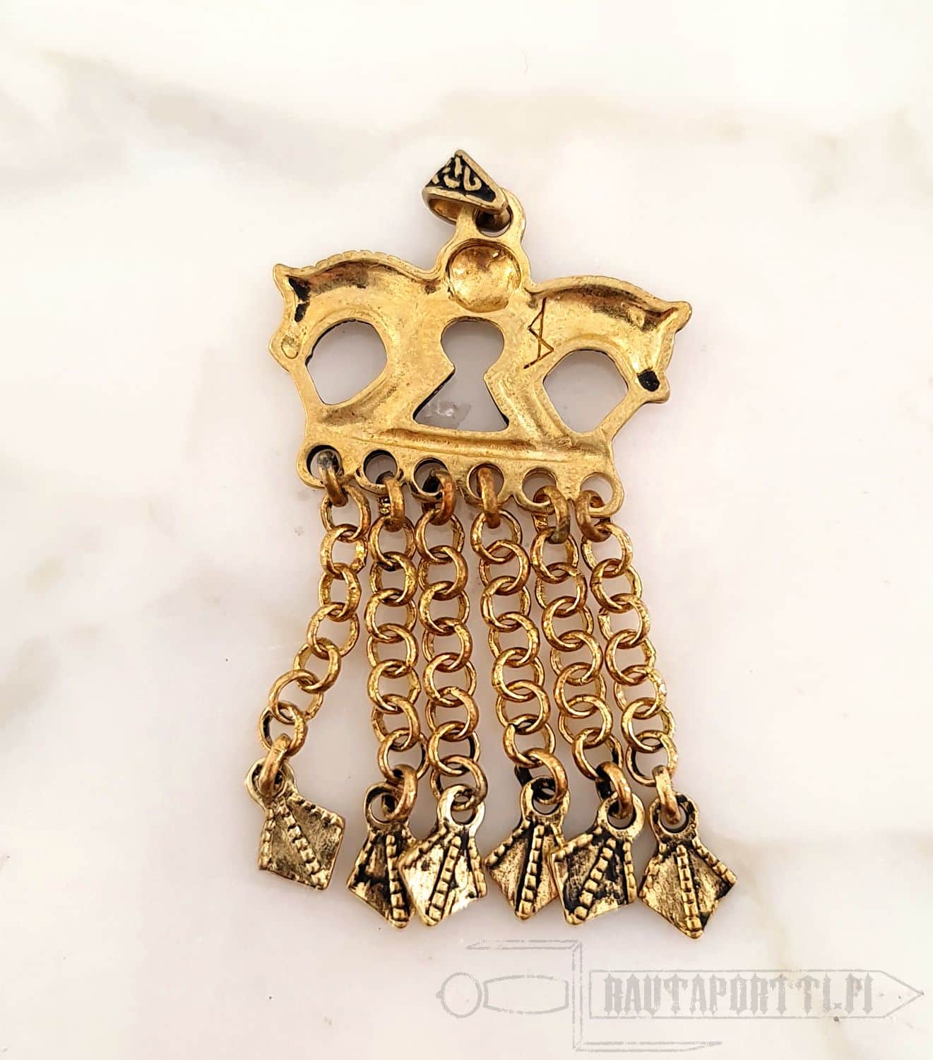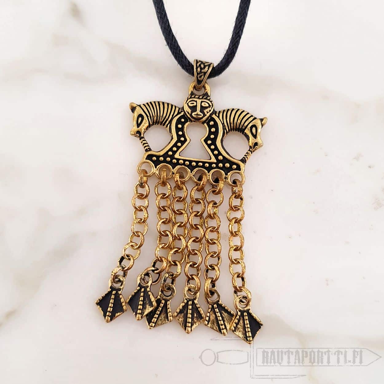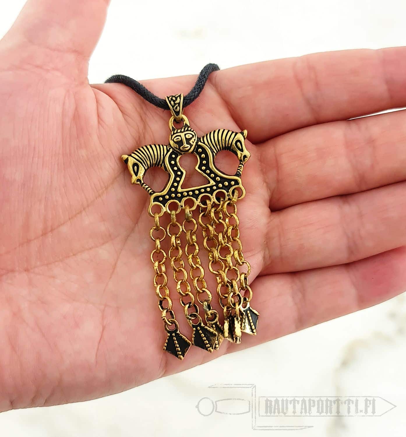 In Finnish mythology, horses are sometimes associated with the battle between the demigod bard Väinämöinen and his rival Joukahainen, two strong opposing forces pulling against each other. The other force being old and wise representing tradition and stability and the other young and ambitious driving change. Väinämöinen and Joukahainen were riding horses and collided into each other and depending on the story and its origin region, the ensuing battle was fought with either spells, songs, swords or bows. It’s also been theorized that Väinämöinen and Joukahainen might have been true gods, and their battle led to the creation of the world. Horses, known in many cultures also as symbols of fertility, would fit into this narrative as well. The two horses also symbolize the Latvian god Ūsiņš and are even found pulling the chariot of the Viking sun goddess Sól (/Sunna). We will never know what the original pendant meant for the owner, but at least we have few different possible ideas.
