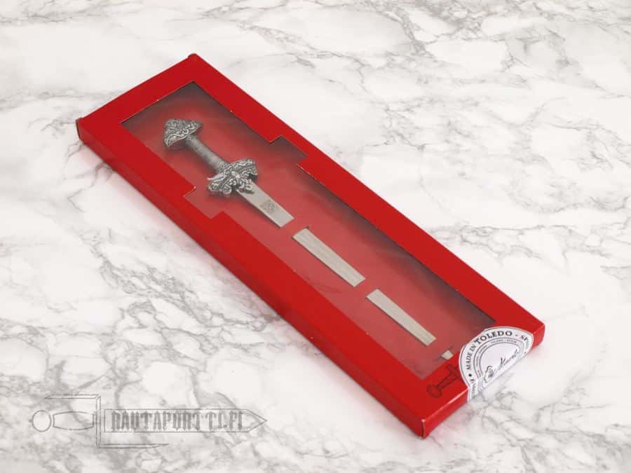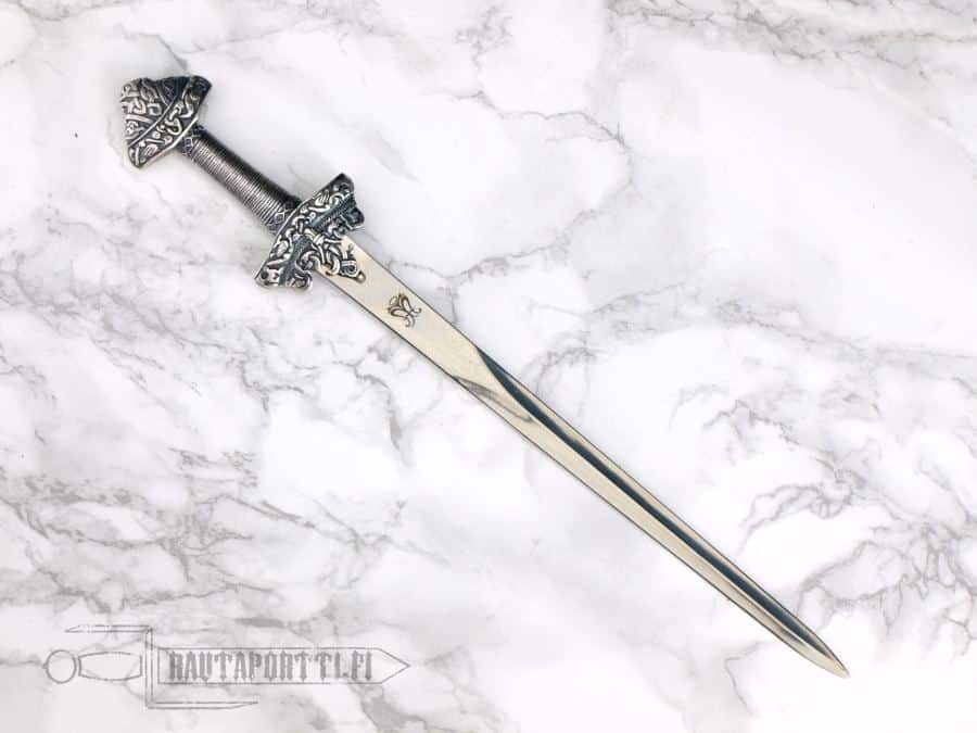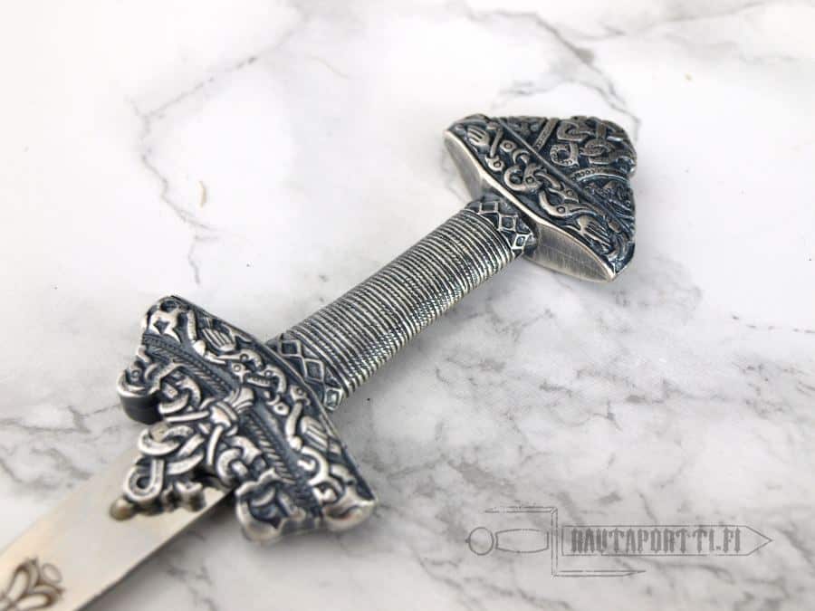 The cocked-hat pommel is the most typical in Norwegian swords from around the 8th century up to around 950. These types of heavy triangular pommels had already been prevalent earlier during migration period, in Merovingian swords, and these early Viking swords, or Carolingian swords, kept that feature. The 800’s was the era when the Viking expeditions and raids became organized, ranging from Lindisfarne to Paris, Lisbon and Pisa. This miniature sword pays homage to this exciting era and weapon.